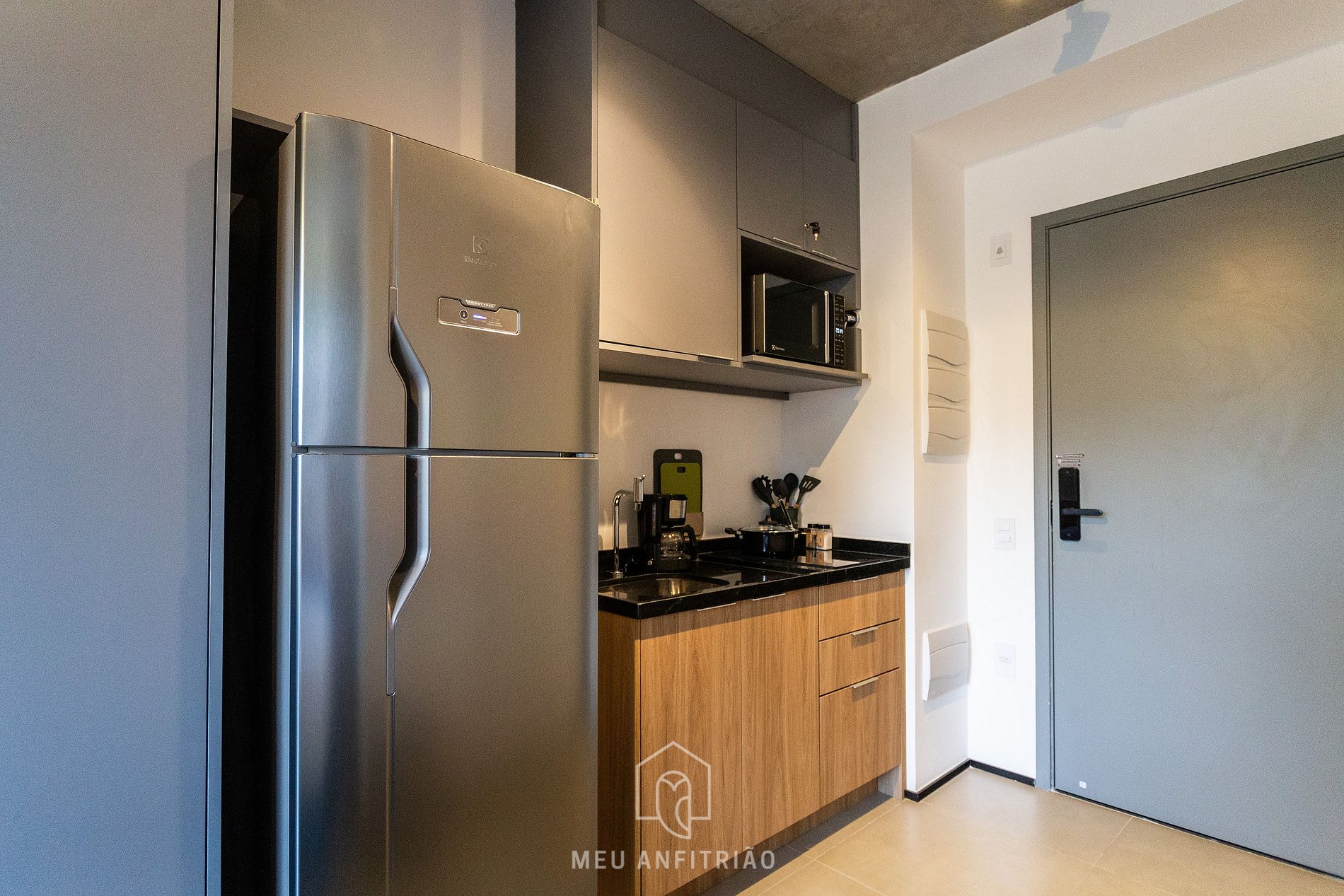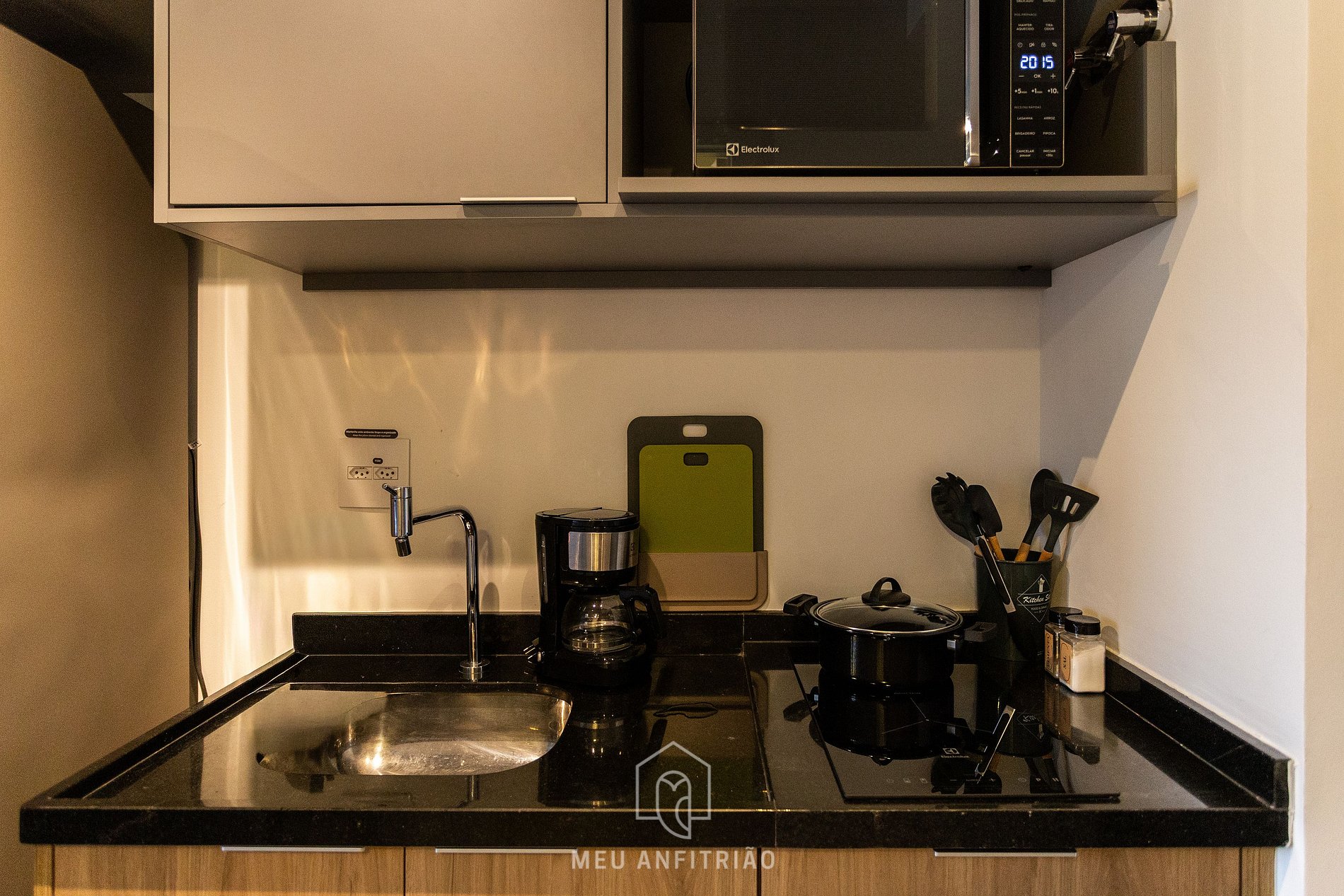 Upon entering the studio, guests will be taken directly to the kitchen, which offers the ideal appliances for a functional stay, such as a stovetop, refrigerator, microwave, sandwich maker, blender, coffee maker, and electric kettle, among other amenities.