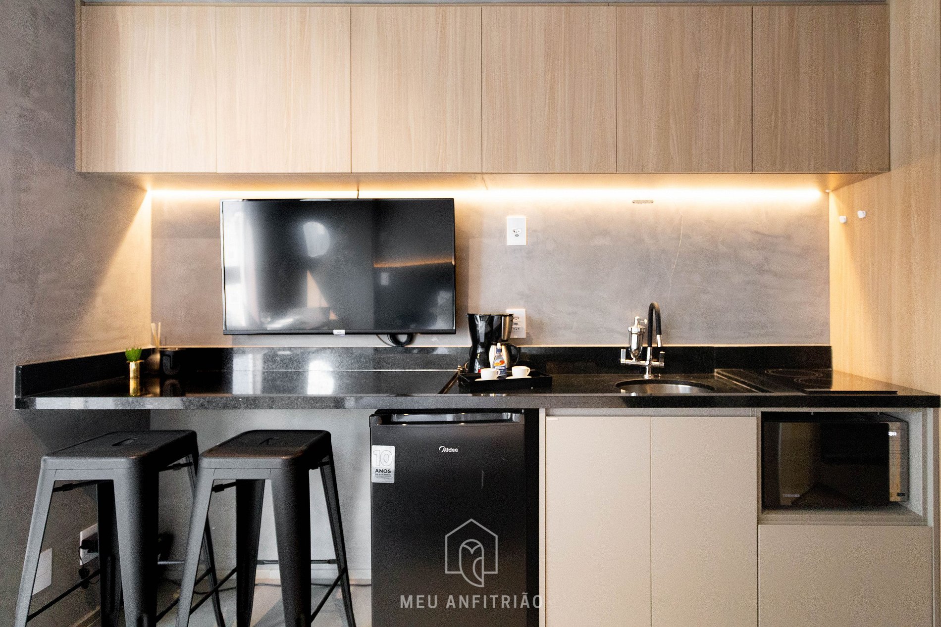 In the same space, we have a kitchen with the necessary utensils for a practical stay, such as a cooktop stove, refrigerator, microwave, blender, sandwich maker, among others, as well as a bathroom, closet, Smart TV, and table with chairs for meals or a home office.