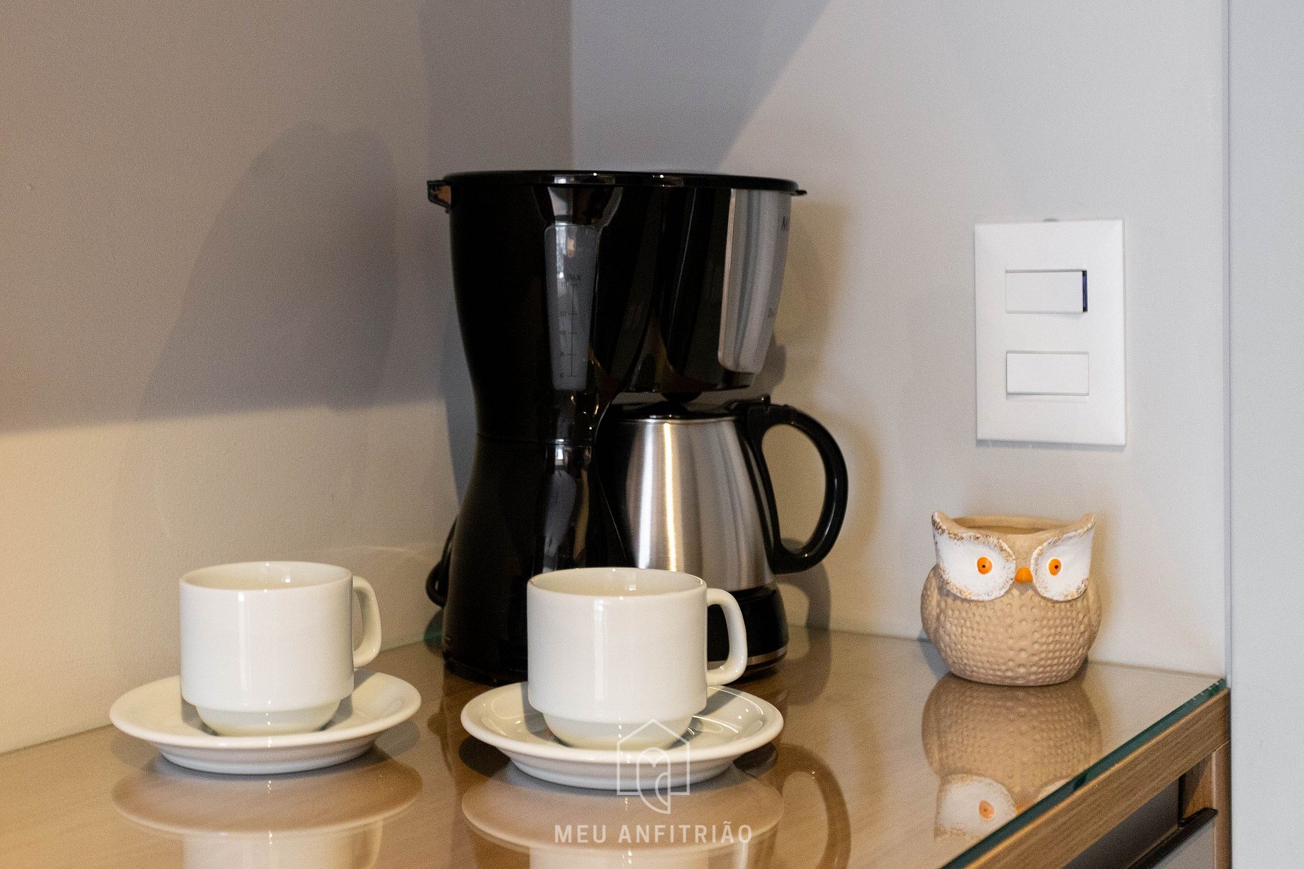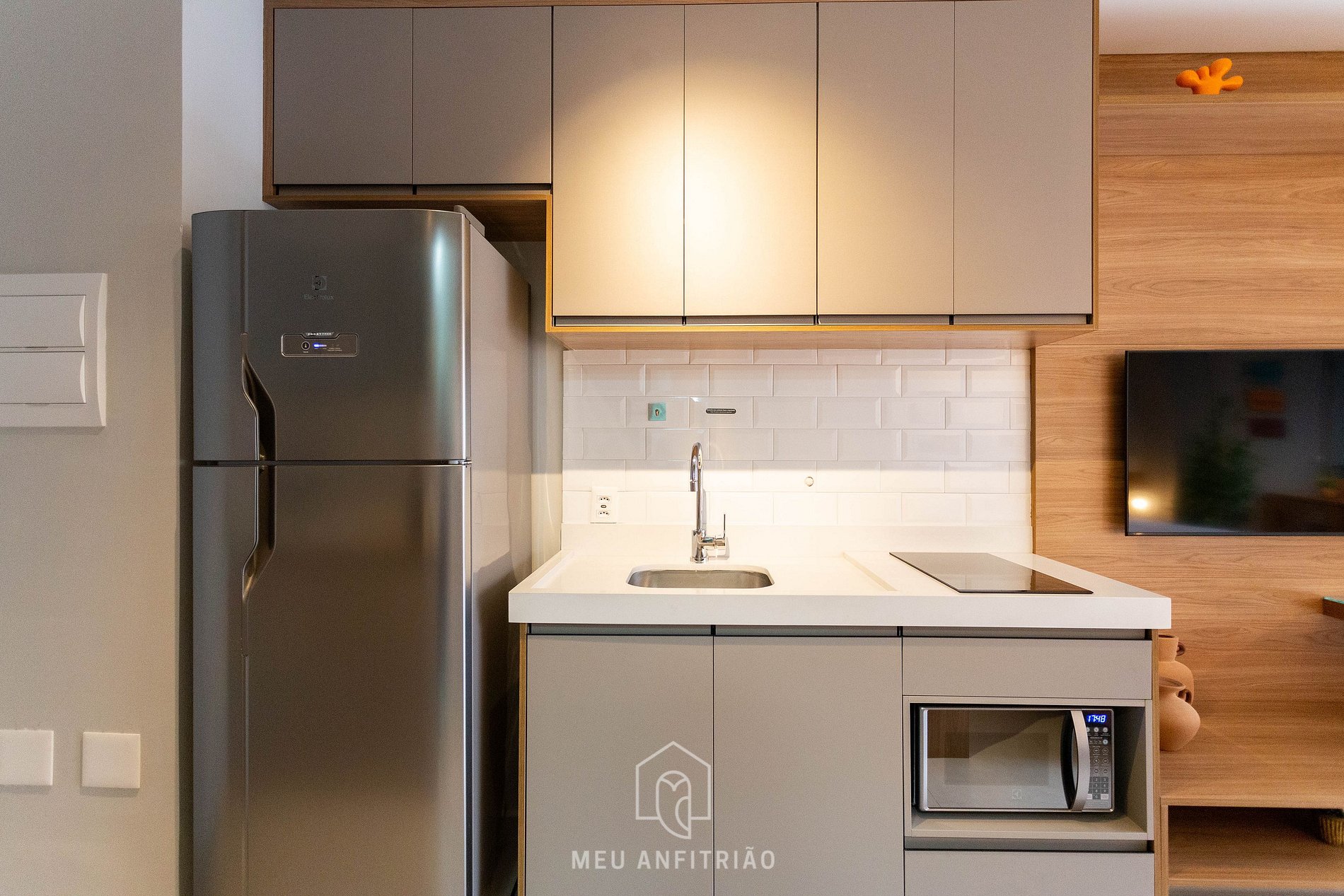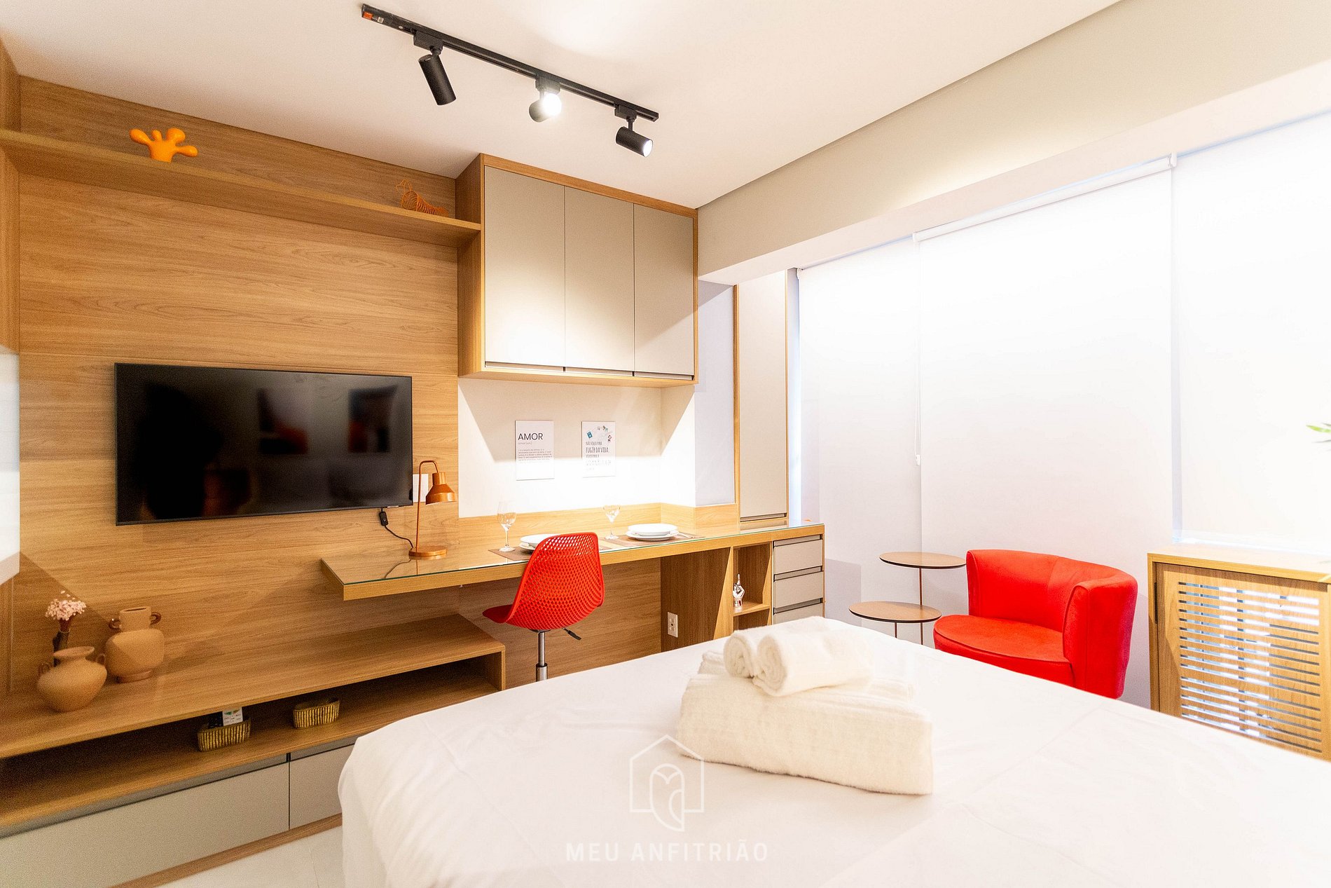 Our studio accommodates up to 2 people in a double bed. In the same environment, we have a kitchen with utensils necessary for a practical stay, such as a cooktop, refrigerator, microwave, blender, sandwich maker, among others. Next, we have a dining table or home office with a chair.