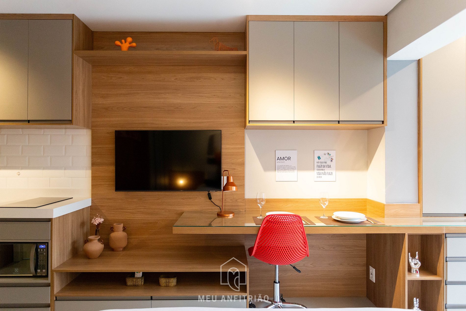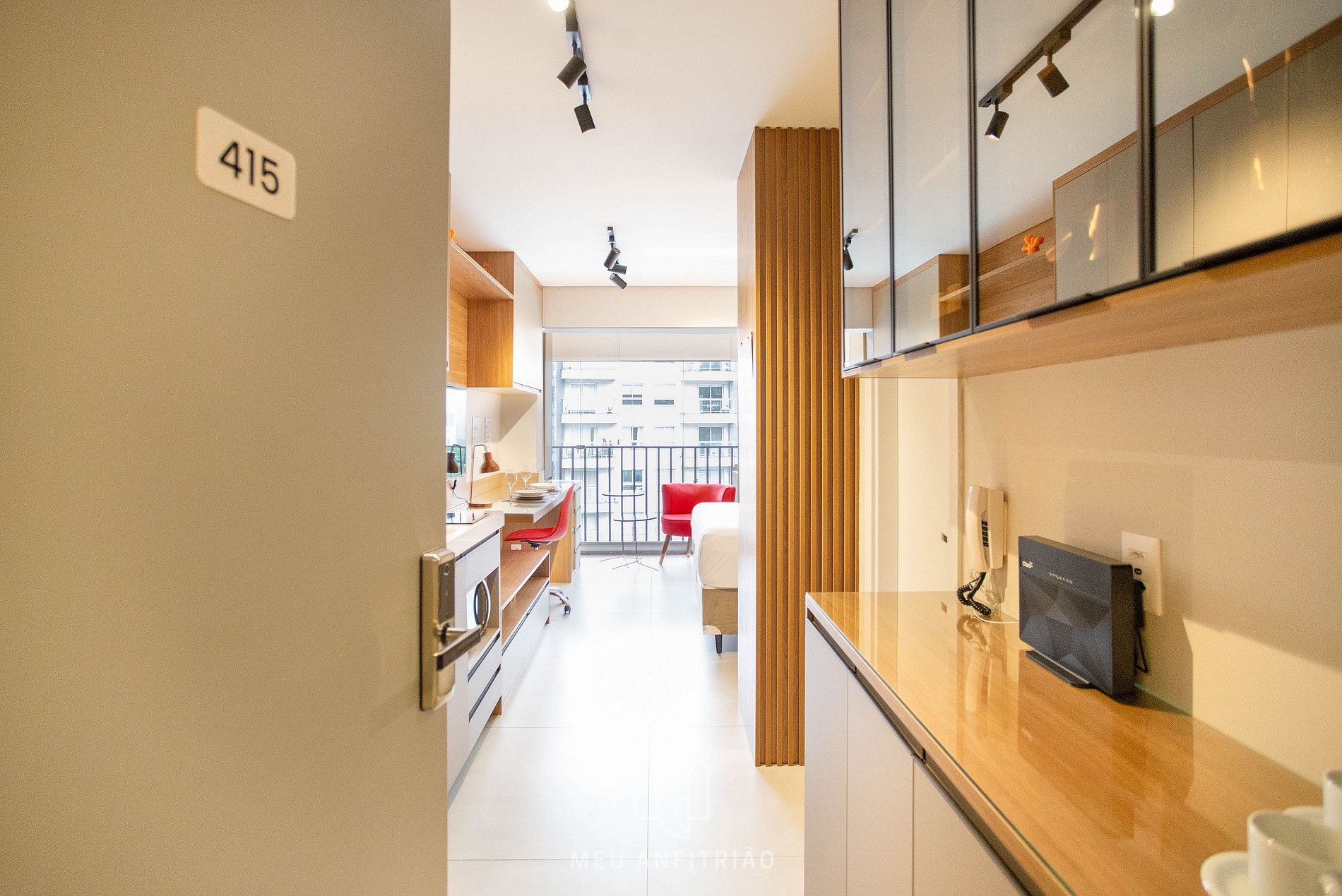 Our studio accommodates up to 2 people in a double bed. In the same environment, we have a kitchen with utensils necessary for a practical stay, such as a cooktop, refrigerator, microwave, blender, sandwich maker, among others. Next, we have a dining table or home office with a chair.