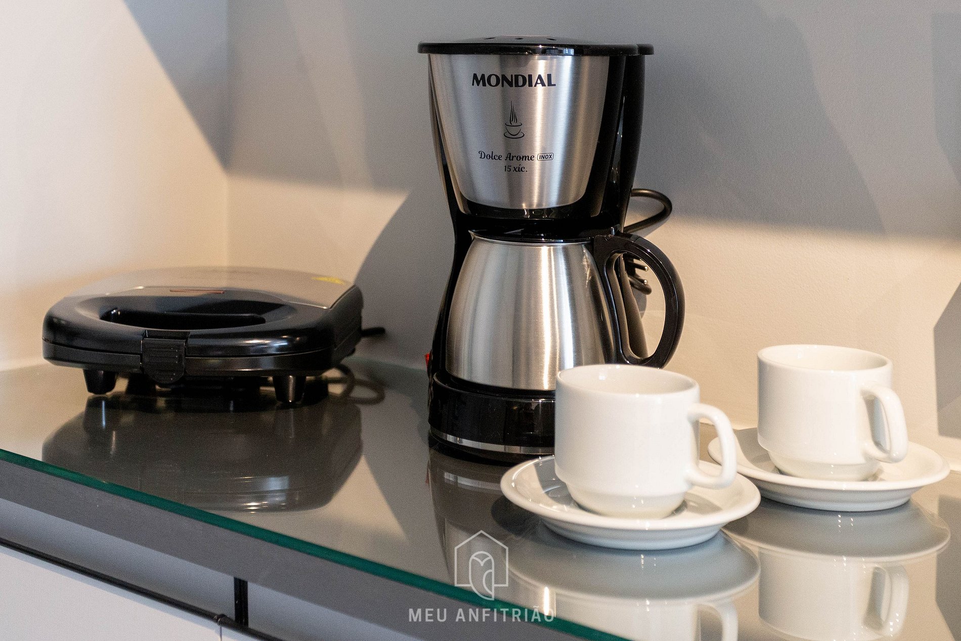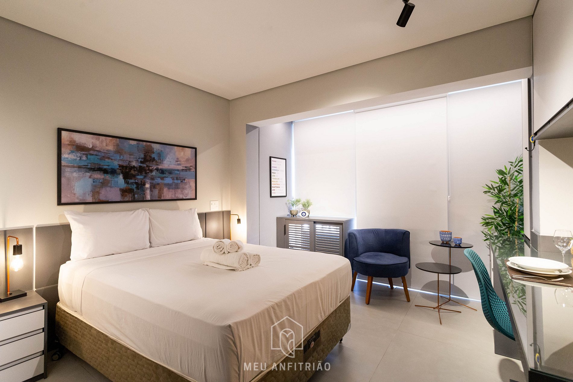 The space is open and functional, with a kitchen equipped with essential utensils for a practical stay, including a cooktop, refrigerator, microwave, blender, sandwich maker, water filter, and more. The studio also features a bathroom with a gas shower, cabinets, a Smart TV, and a dedicated home office area.