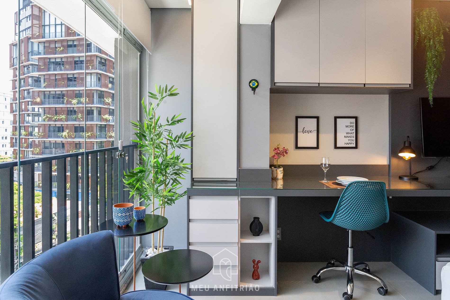 The balcony is integrated into the studio and offers a relaxing armchair, blackout curtains, and glass windows for added privacy and security.