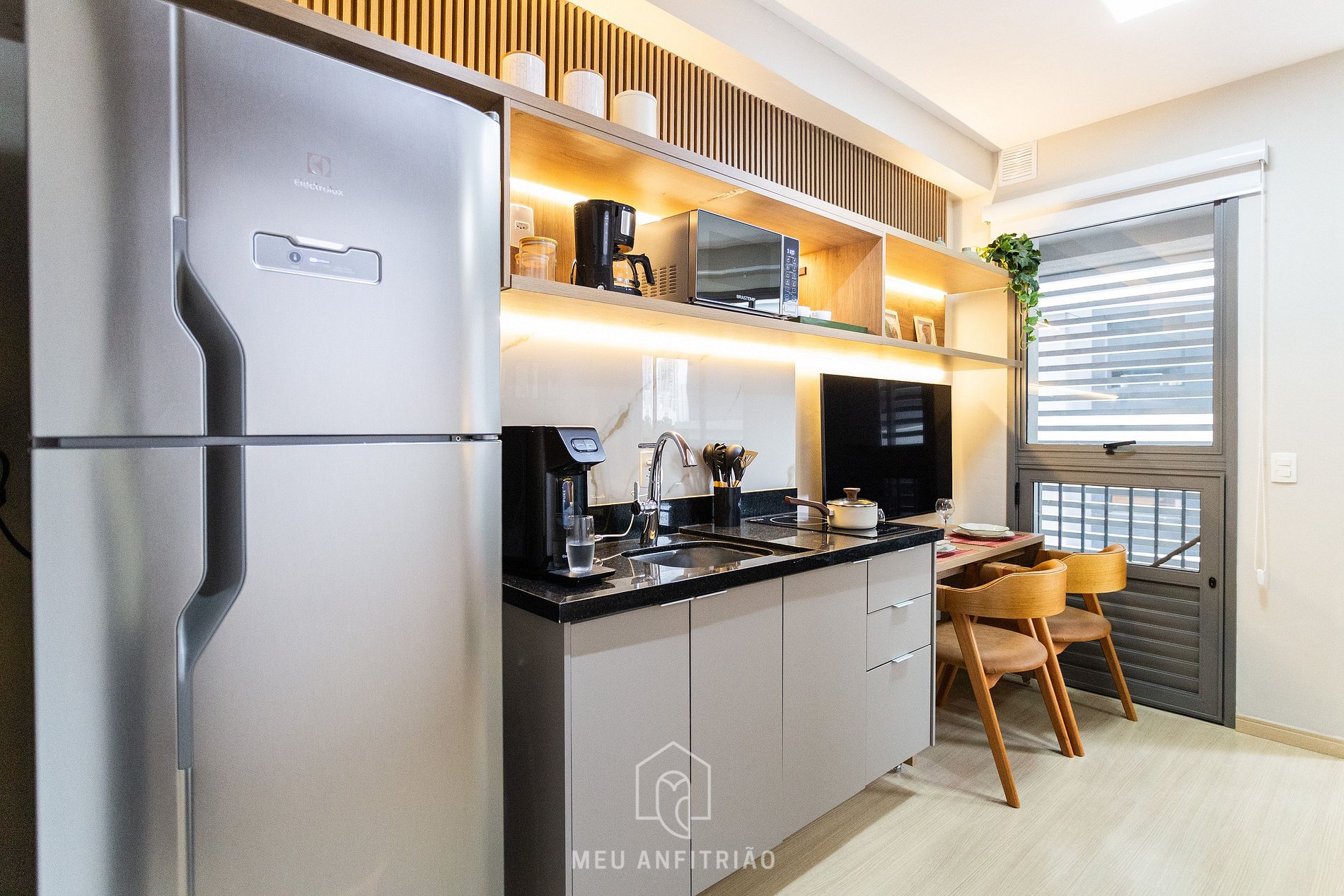 - Kitchen equipped with refrigerator, built-in cooktop, microwave, electric coffee maker, water filter, sandwich maker, blender, and other essentials for a comfortable stay.