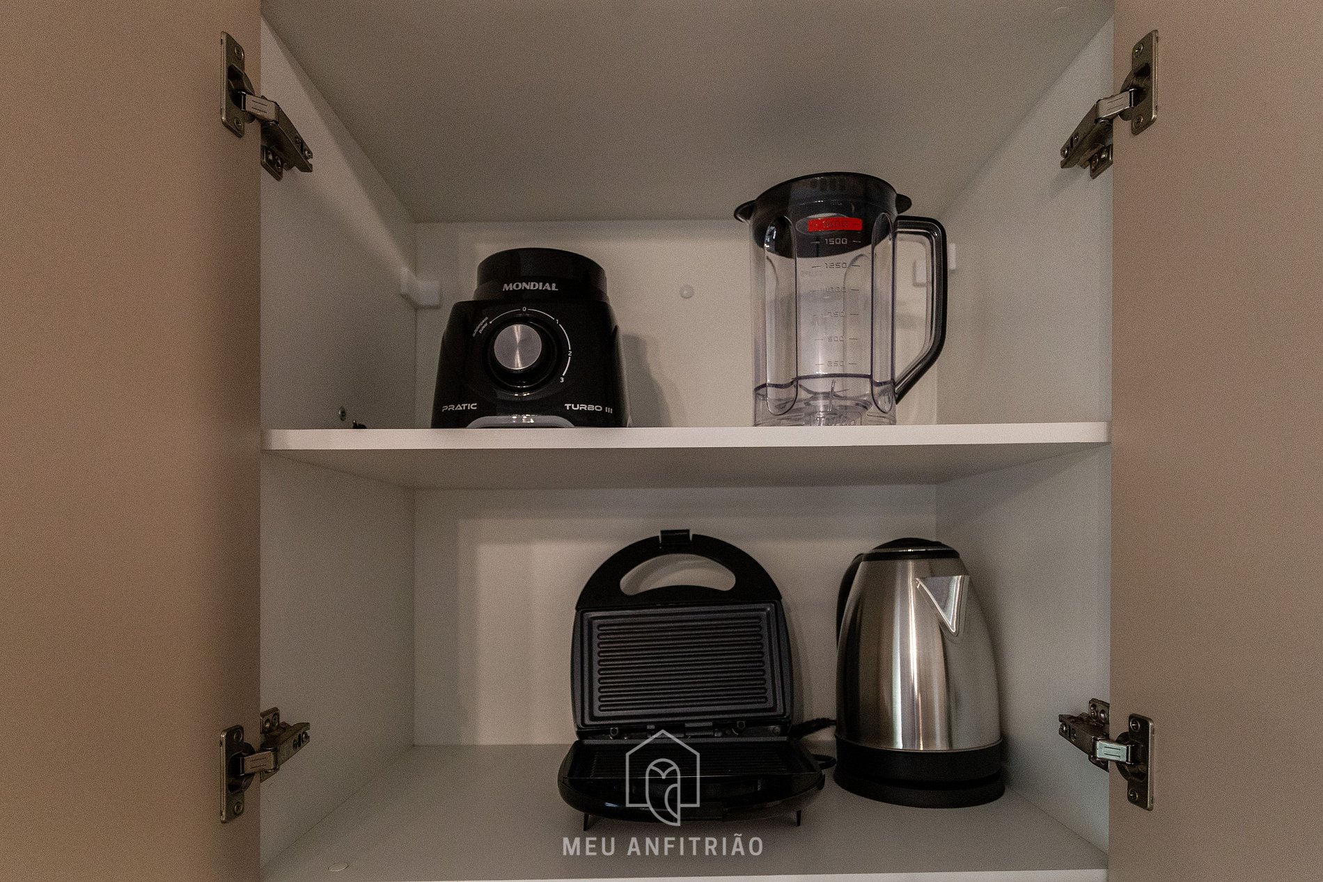 - The kitchen includes a refrigerator, water filter, single-burner portable cooktop, microwave, blender, electric kettle and coffee maker, sandwich maker, and other utensils for a convenient stay.
