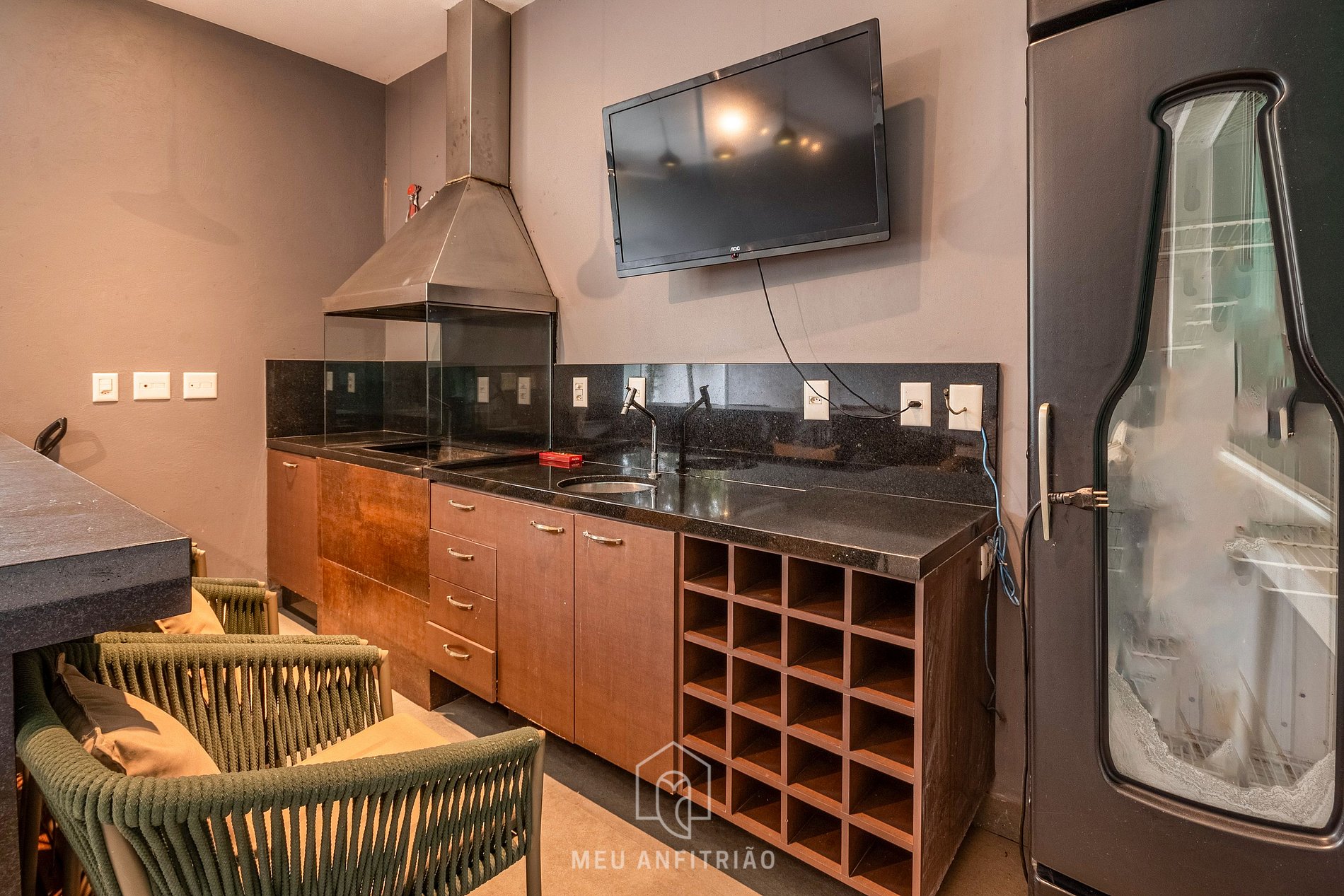 - Gourmet area with a barbecue grill, Smart TV, table, chairs, sofa, refrigerator, and powder room.