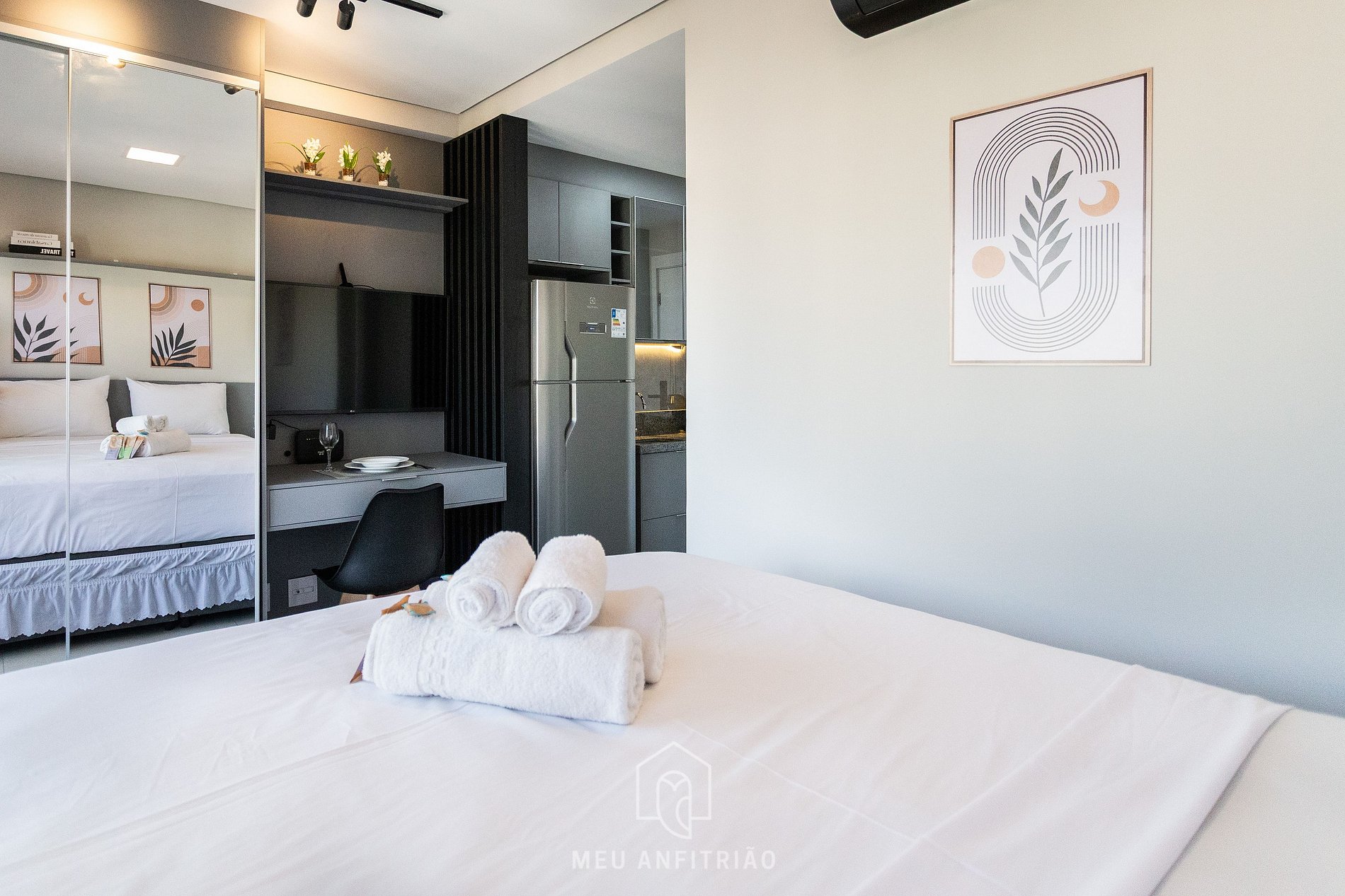 - The studio space offers a queen-size bed, wardrobe, balcony, Smart TV, hot and cold air conditioning, and a table for home office or meals.