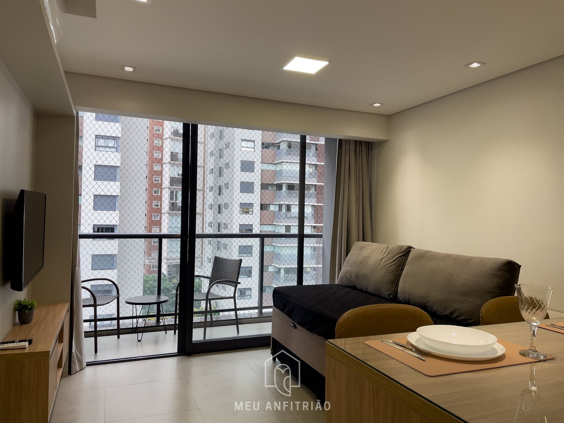 - A balcony that divides the spaces and has a glass door enclosure and blackout curtains, with chairs and a view of the region, as well as child safety screens.