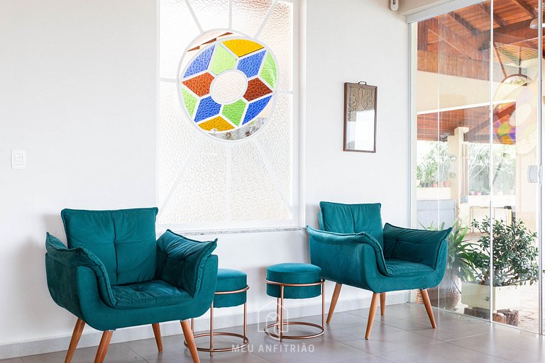 O espaço dispõe piscina, churrasqueira, salão de jogos, gramado, jardim, adega, salas de TV, sala de jantar, mesa de sinuca, área para picnic, cozinha compartilhada e lavabos. Também é disponibilizado 1 vaga de garagem descoberta por suíte dentro da pousada e a recepção é 24h.