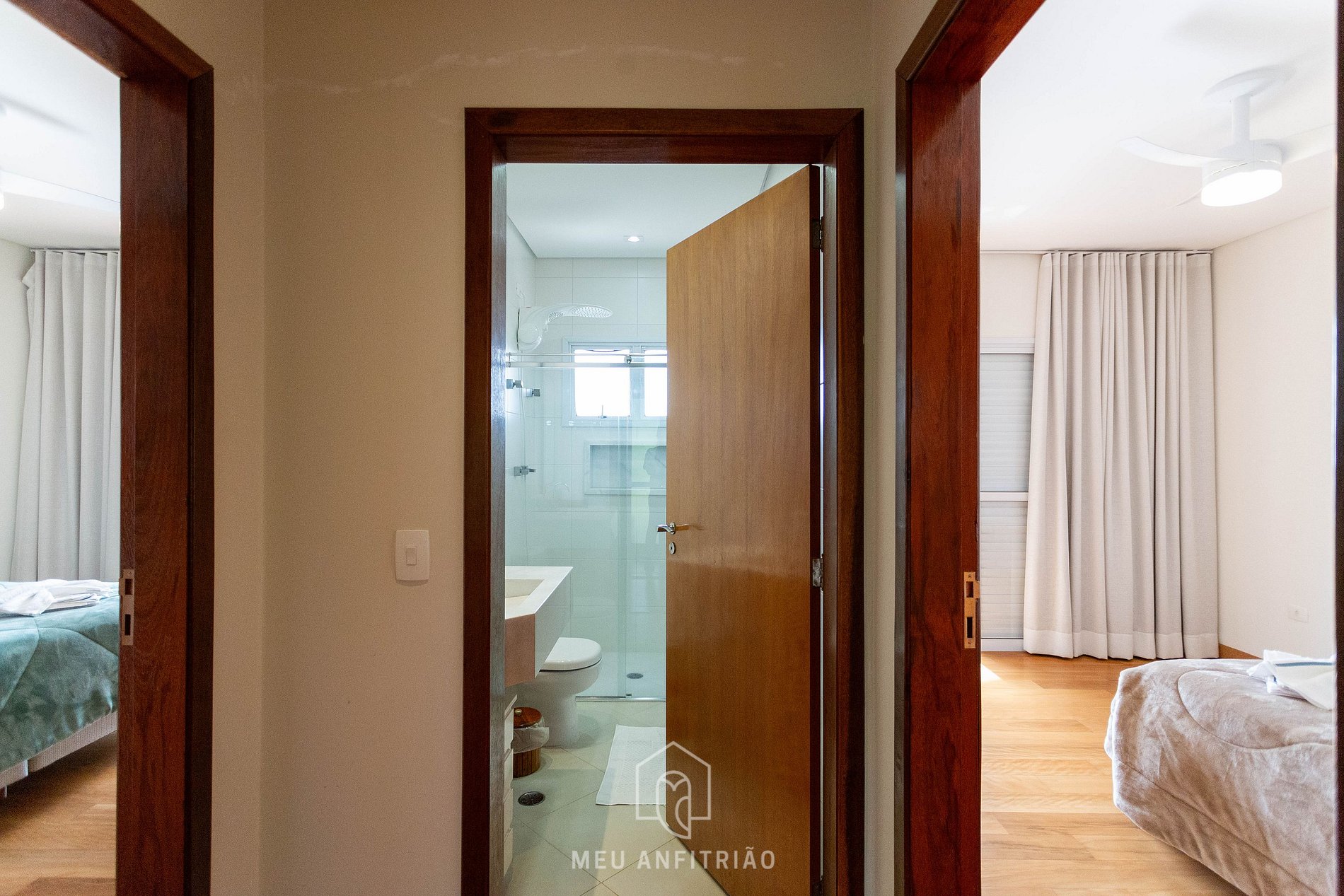 The suite is connected and is located on the second floor of one of the guesthouse's houses. The bedrooms are separated by doors for greater privacy, with a king bed in each that can be divided to become 4 single beds. Both bedrooms have a ceiling fan, the bathroom has an electric shower and is shared by both bedrooms, in addition to the balcony, which has a privileged view of the Serra da Cantareira.