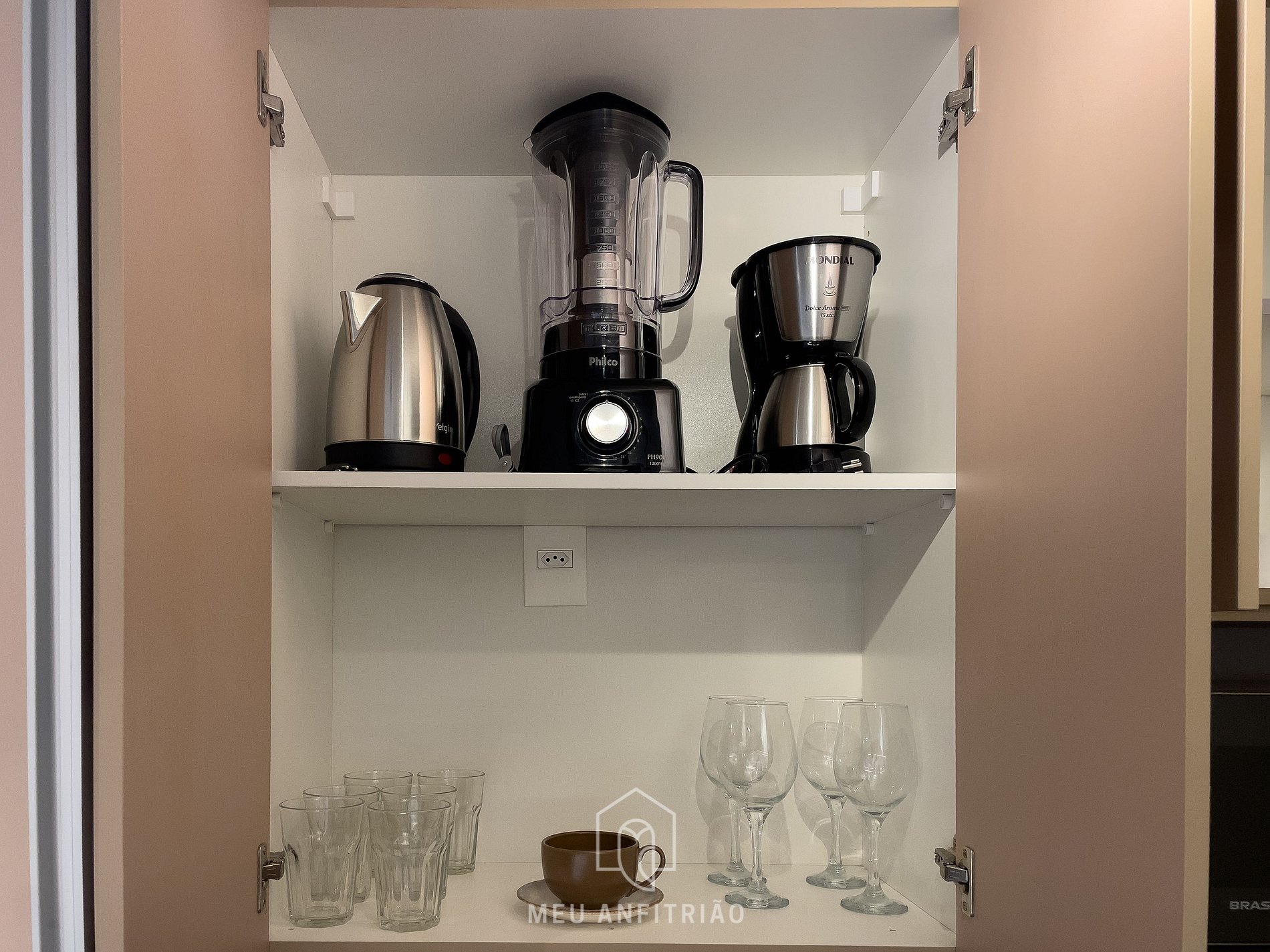 - Full kitchen featuring a cooktop stove, refrigerator, microwave, water filter, blender, coffee maker, and electric kettle, among other appliances.