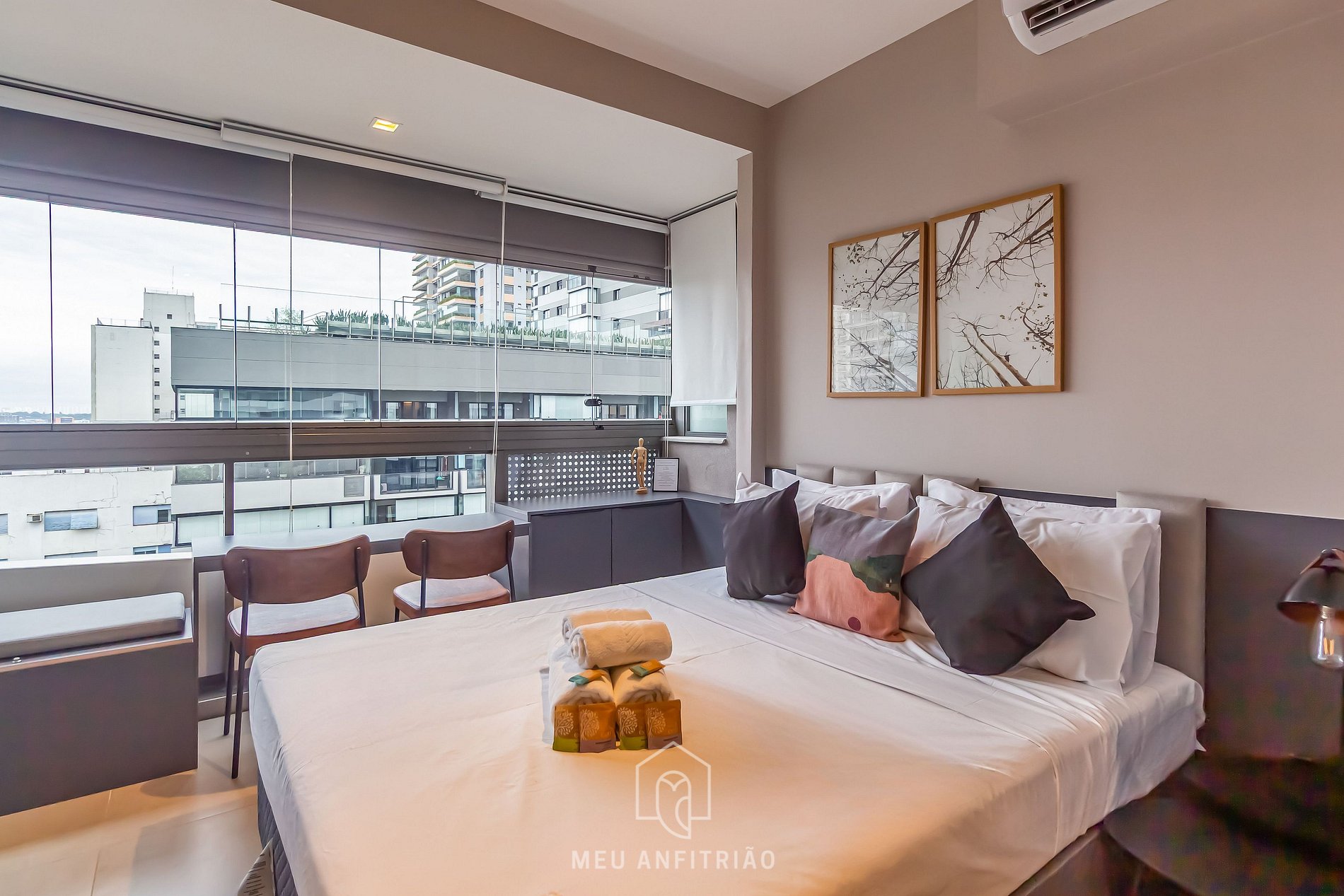 - Studio space with a queen-size bed, air conditioning, Samsung Smart TV, cushioned bench, table and chairs for meals or home office, and enclosed with glass windows and blackout blinds.