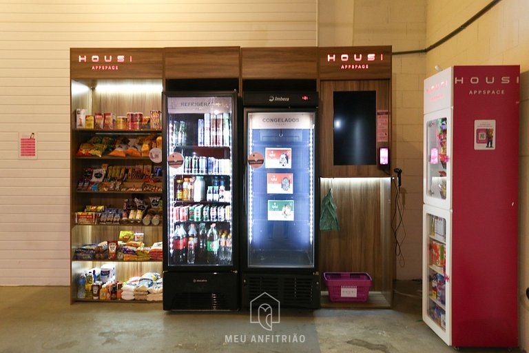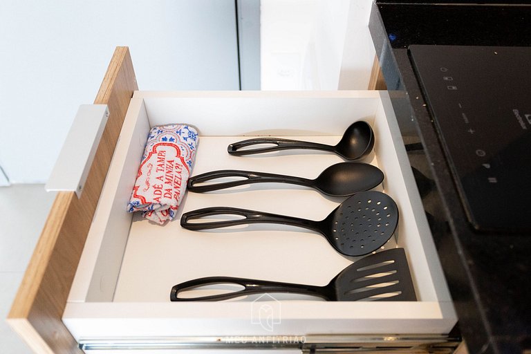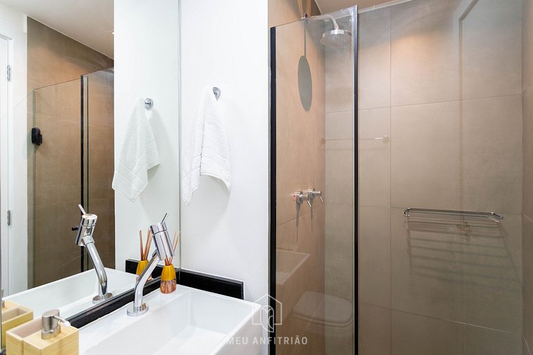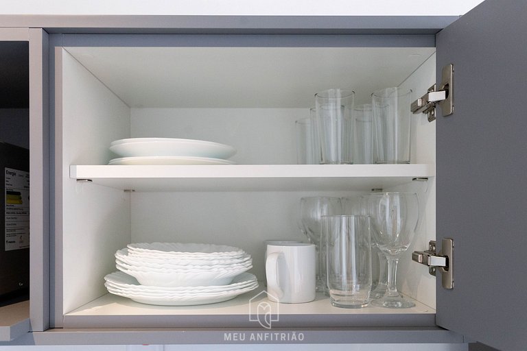 Upon entering, guests will have access to the kitchen, which has all the necessary utensils for their stay, such as a refrigerator, cooktop stove, microwave, sandwich maker, among others. The balcony is integrated into the studio and has a privileged view of the region, in addition to having blackout blinds and glass windows.