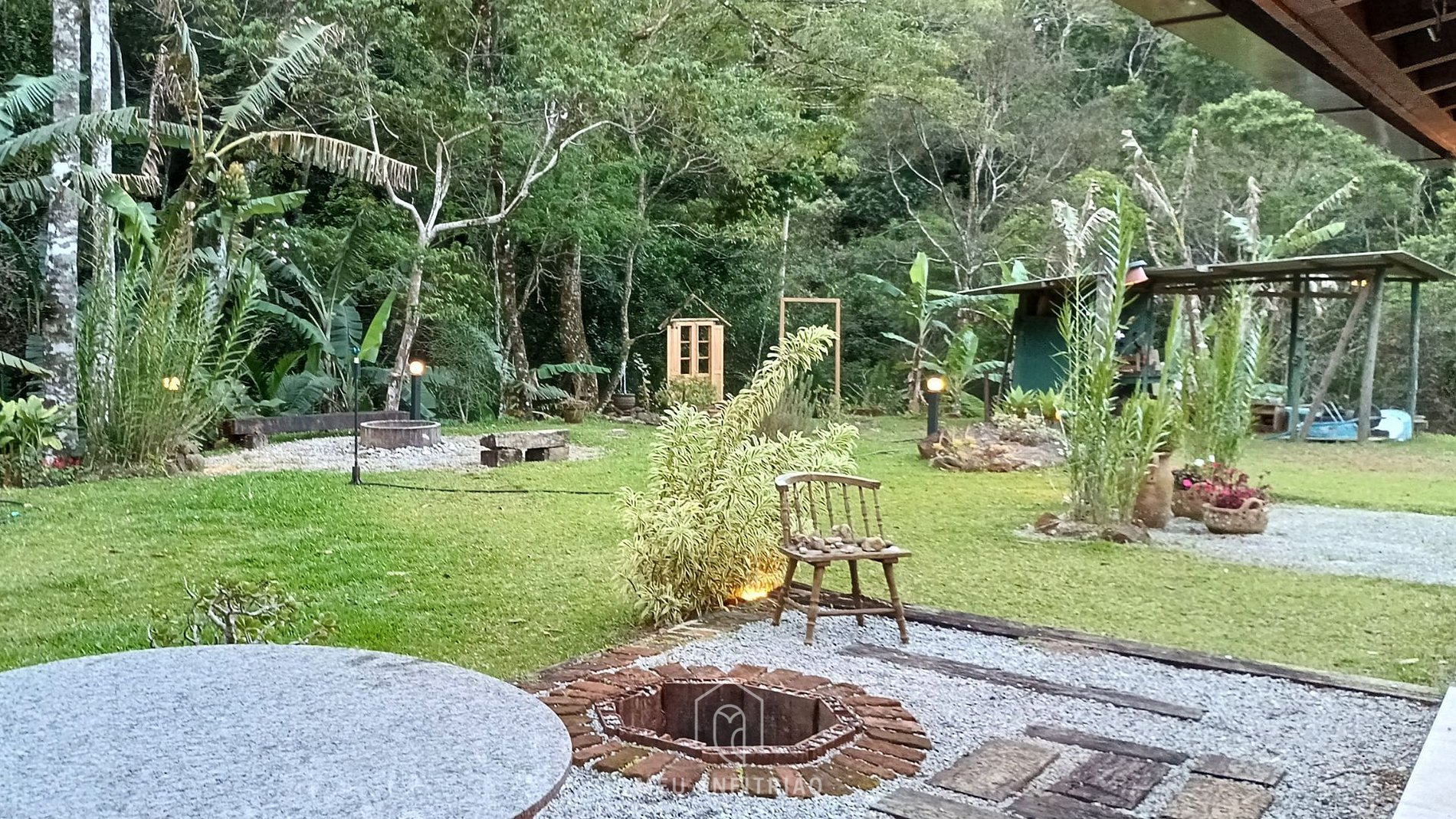 Upon arriving at the property, guests are greeted by a large garden that brings together different leisure spaces and opportunities to connect with nature. The area features a fire pit, barbecue grill, a stream with a waterfall, an outdoor shower, a clothesline, and an antique English iron bed with an aquablock mattress for enjoying the sun and reading a book while relaxing outdoors, as well as a table and chairs to enjoy the outdoor environment.