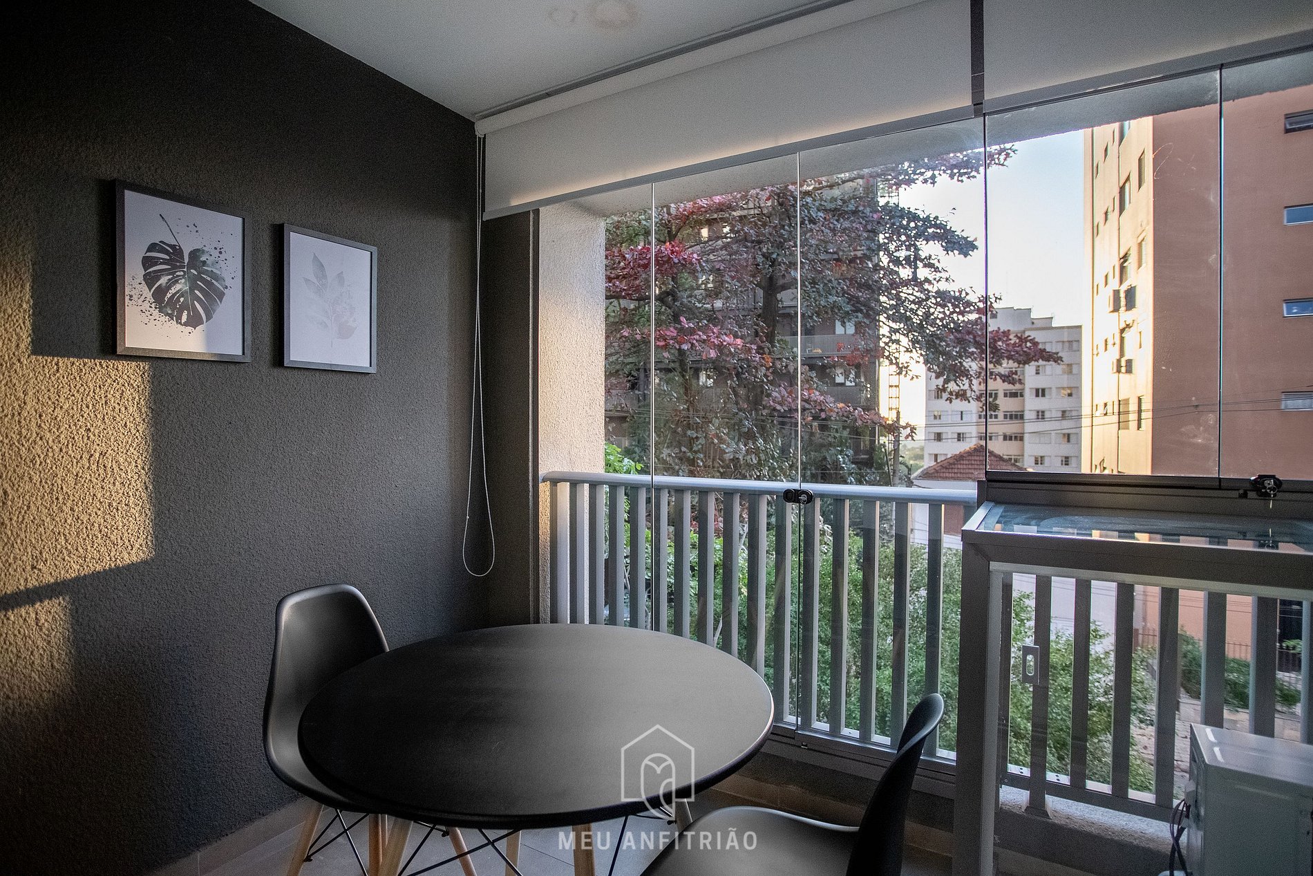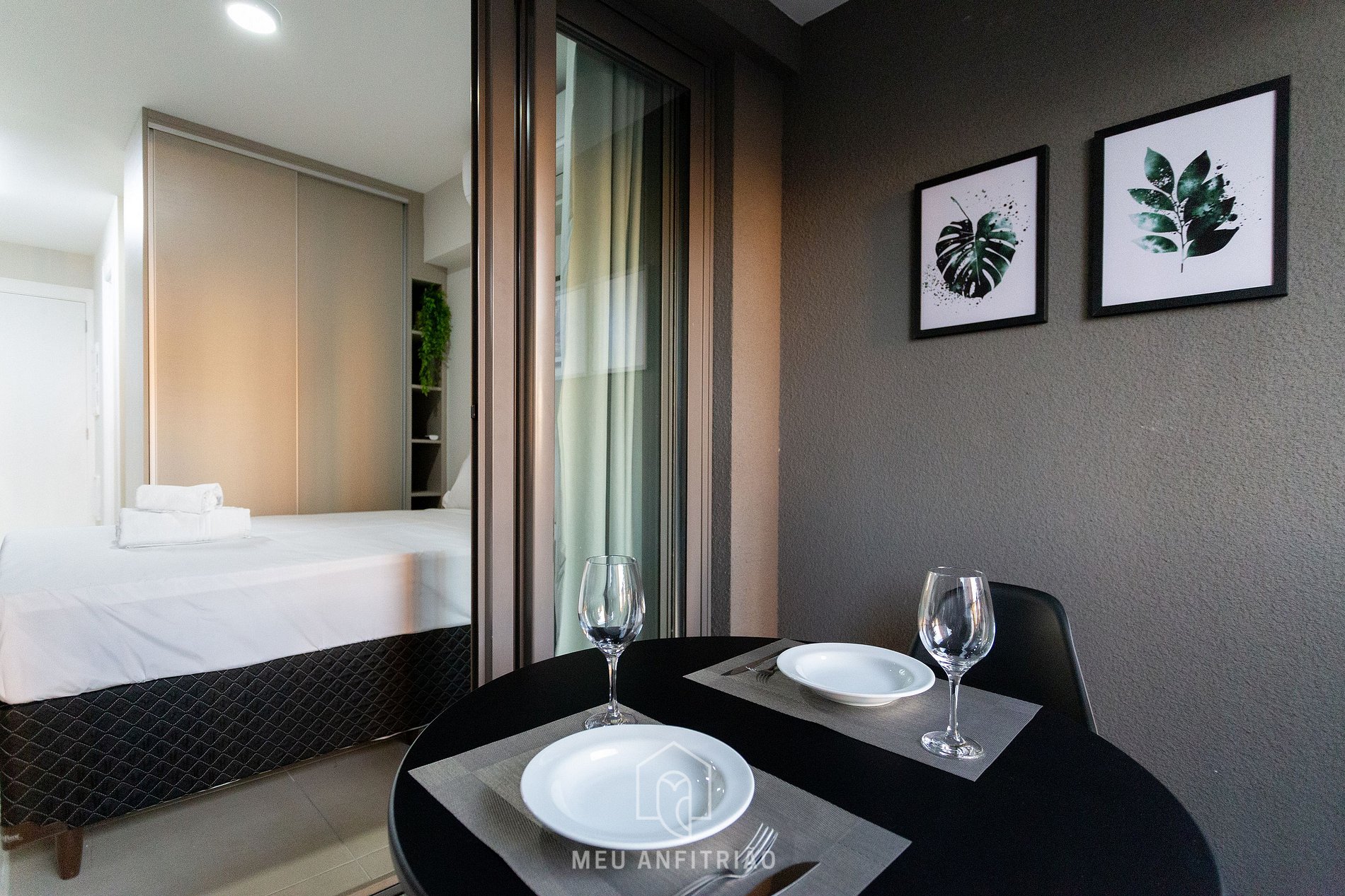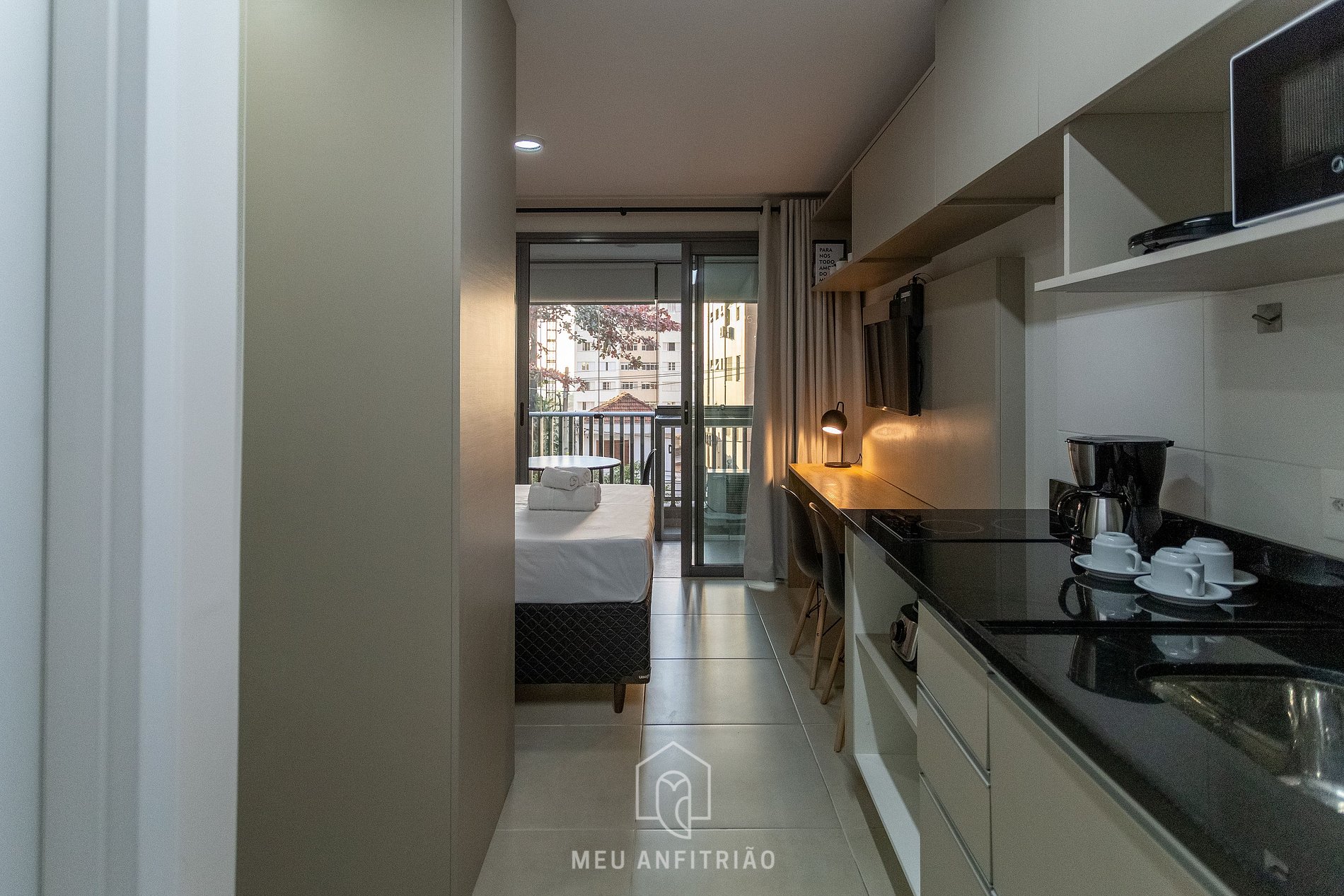 In the same environment we have a kitchen with utensils necessary for the stay, bathroom, closet, desk for home office and Smart TV. A balcony with a glass door separates the spaces. There is a table with chairs on site to take advantage of the outdoor environment. For a more cozy environment, we have blackout curtains in the apartment's balcony.