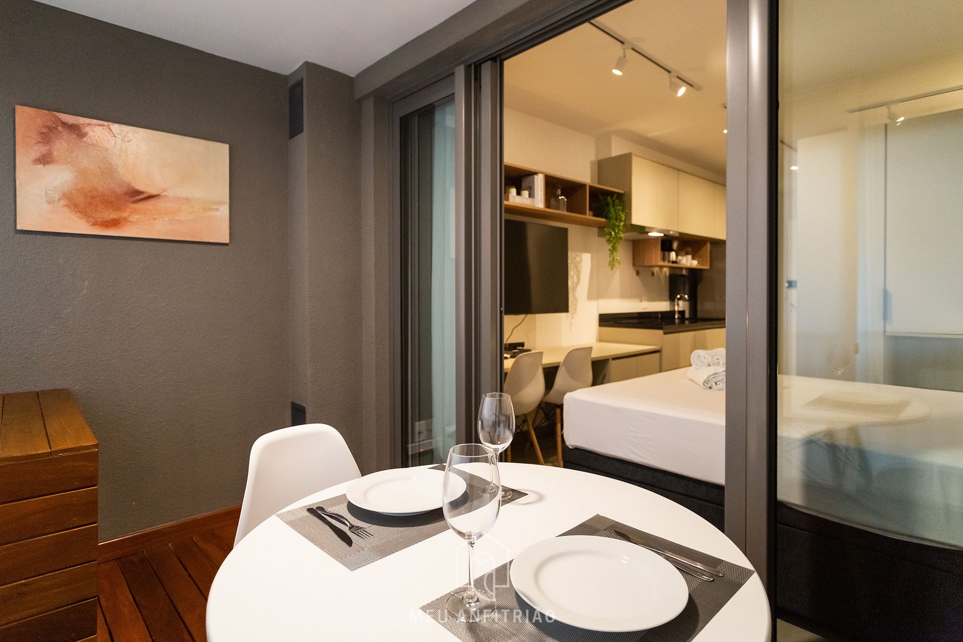 In the same environment we have a kitchen with utensils necessary for the stay, bathroom, closet, desk for home office and Smart TV. A balcony with a glass door separates the spaces. There is a table with chairs on site to take advantage of the outdoor environment. For a more cozy environment, we have blackout curtains in the apartment's balcony.