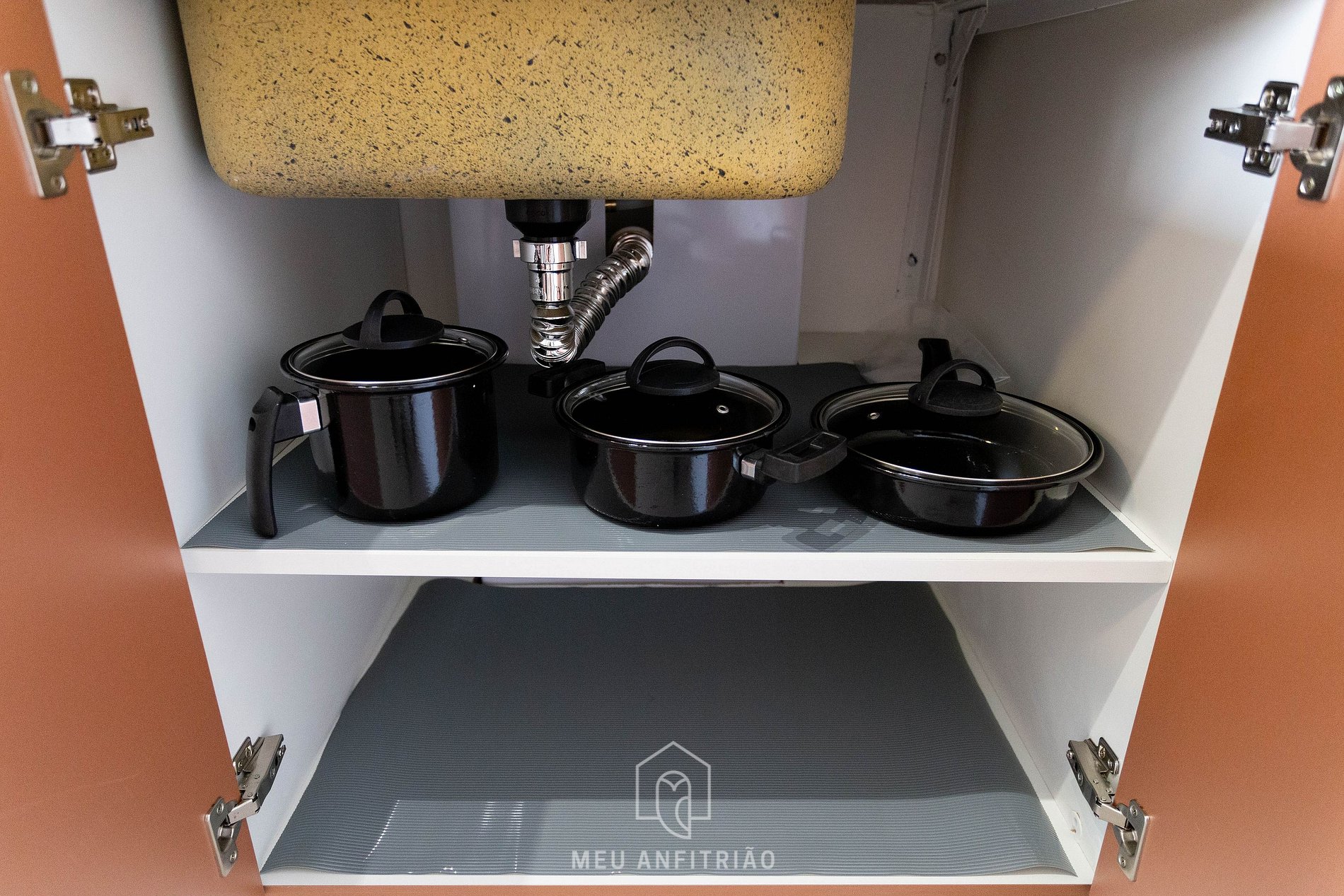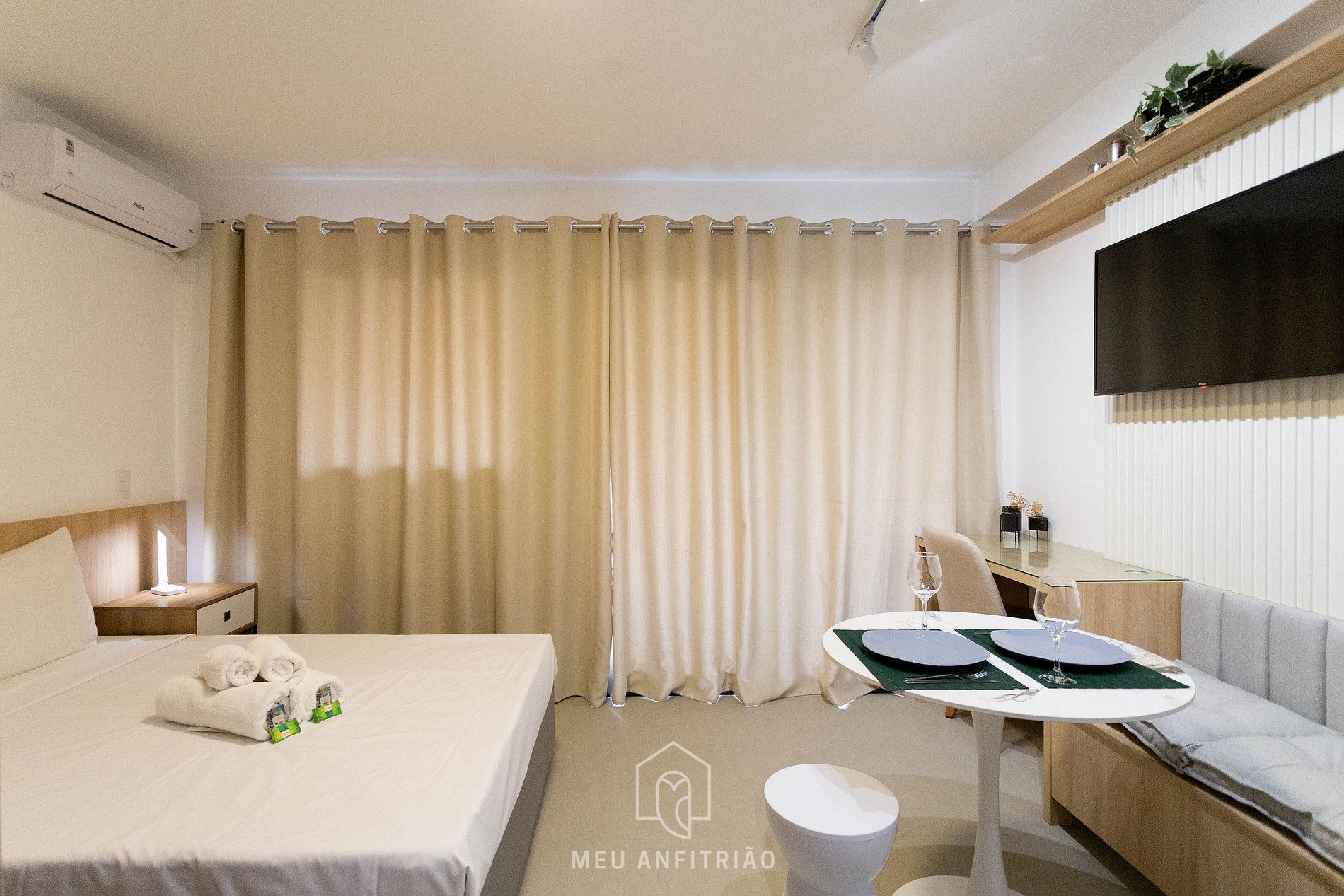 Upon entering the studio, guests will have access to the kitchen, which has all the necessary utensils for a practical stay, such as a refrigerator, cooktop stove, microwave, water filter, sandwich maker, blender, Nespresso coffee maker, among others. A balcony with a glass door and blackout curtains divides the spaces.