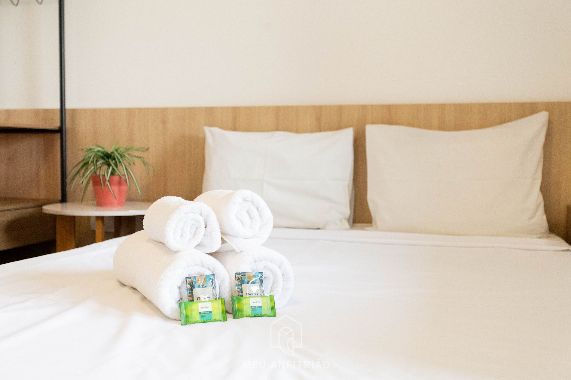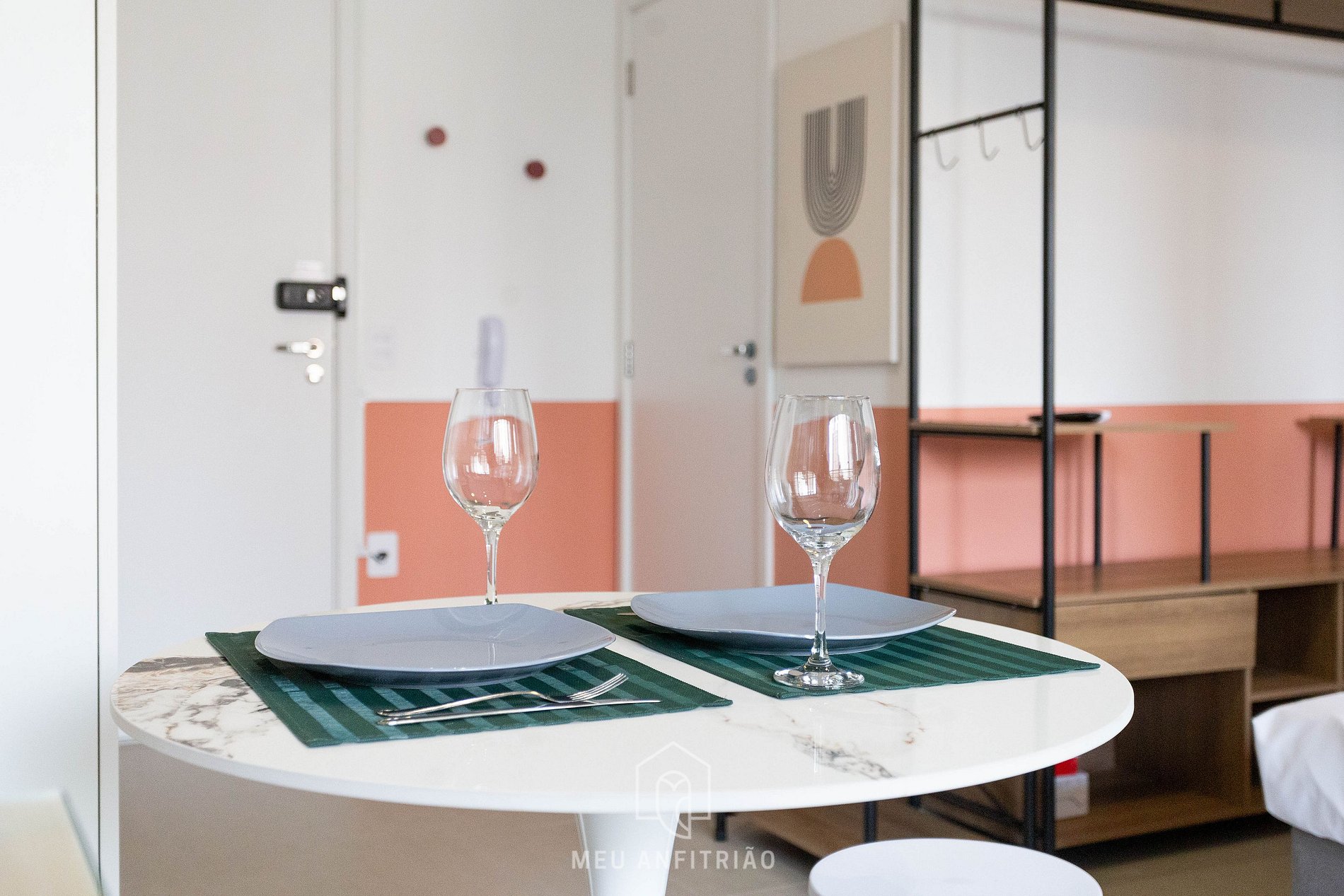 Upon entering the studio, guests will have access to the kitchen, which has all the necessary utensils for a practical stay, such as a refrigerator, cooktop stove, microwave, water filter, sandwich maker, blender, Nespresso coffee maker, among others. A balcony with a glass door and blackout curtains divides the spaces.
