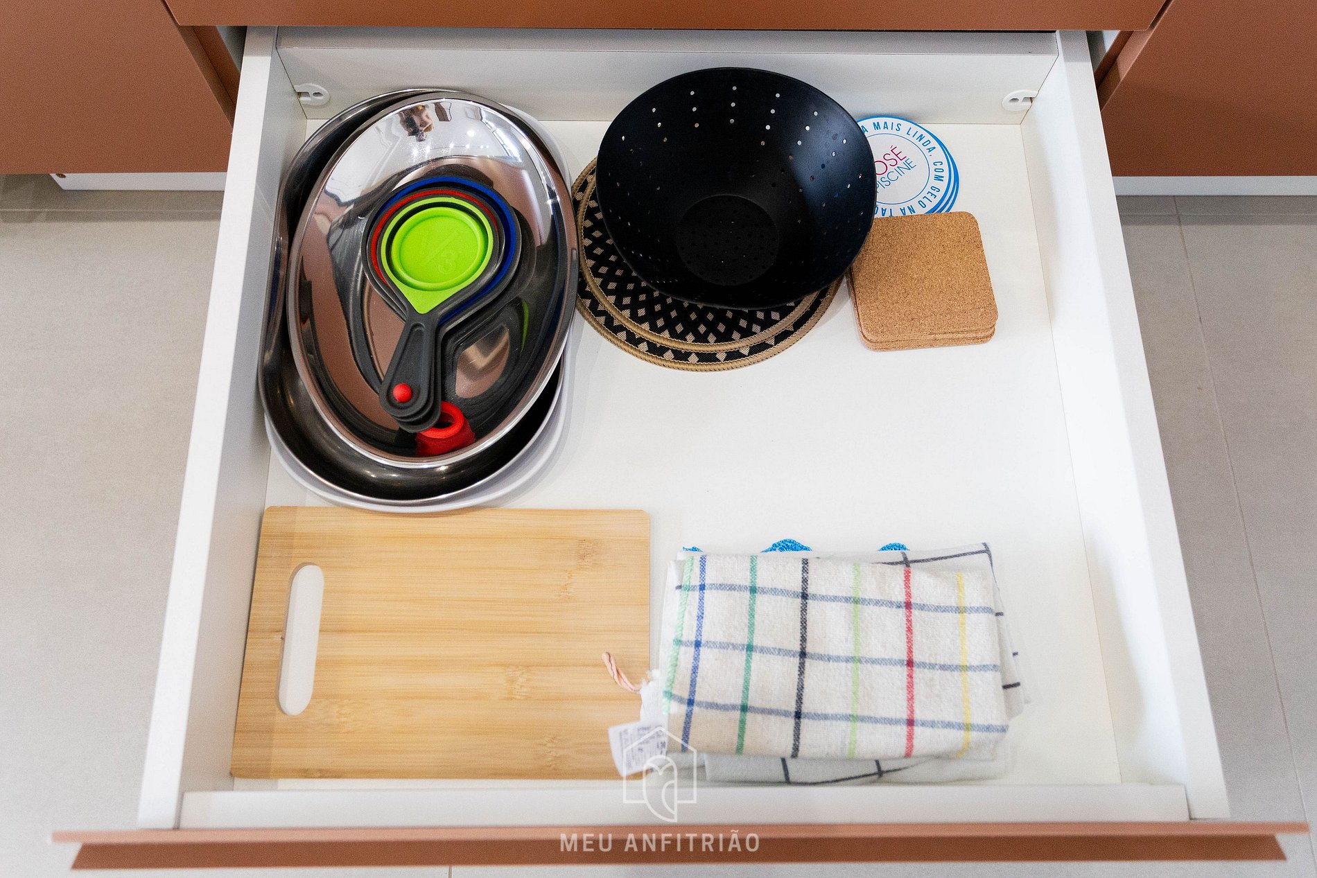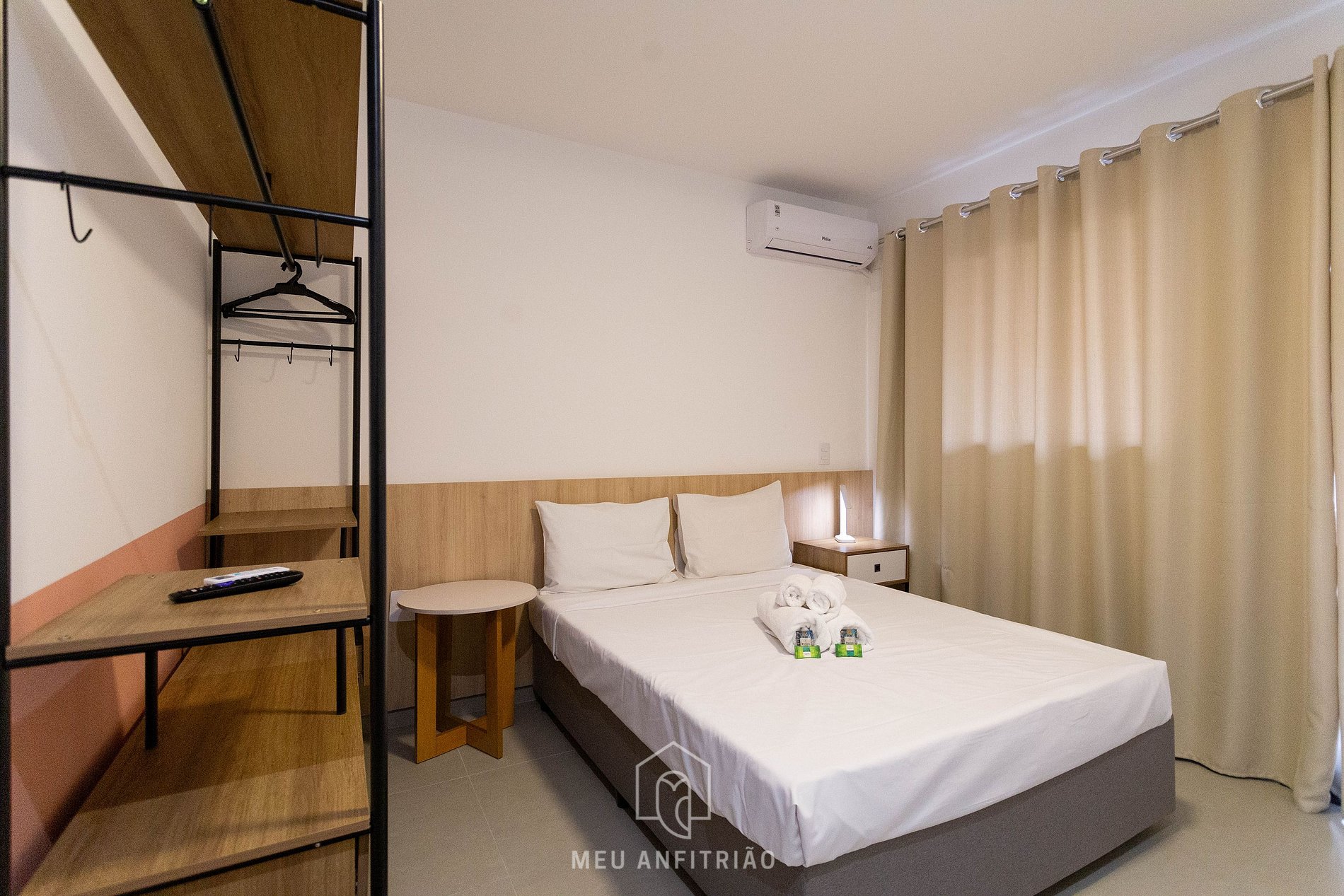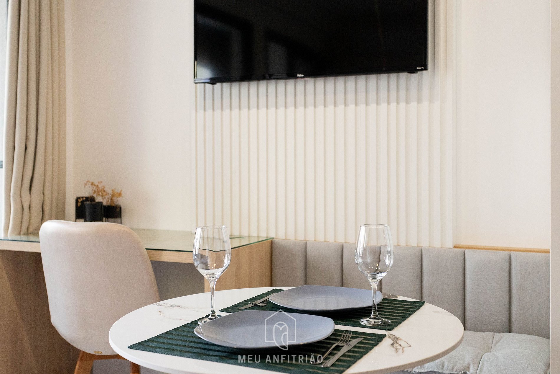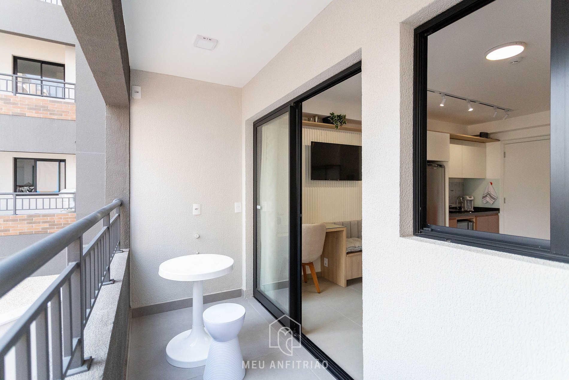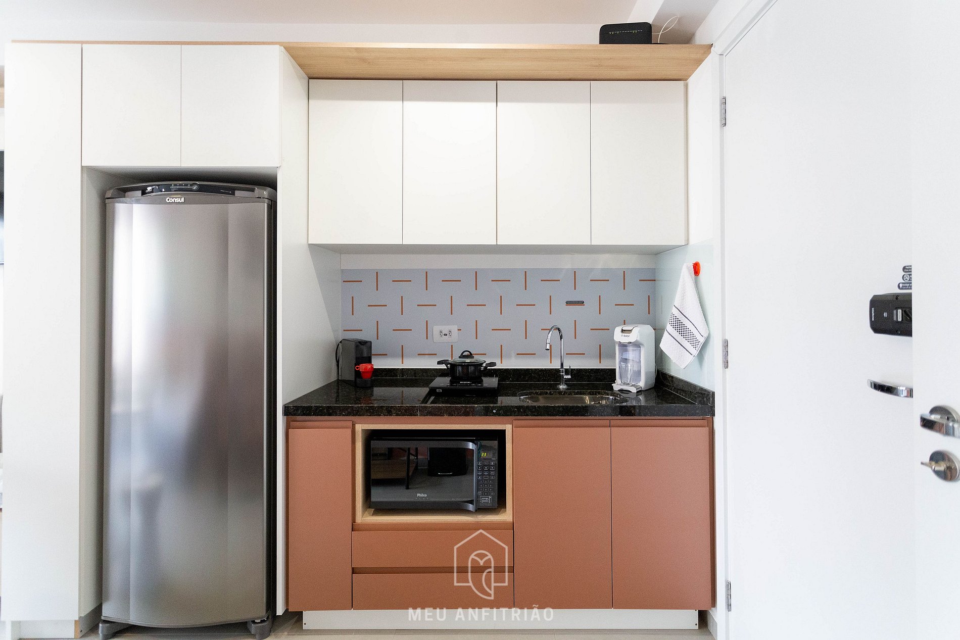 Upon entering the studio, guests will have access to the kitchen, which has all the necessary utensils for a practical stay, such as a refrigerator, cooktop stove, microwave, water filter, sandwich maker, blender, Nespresso coffee maker, among others. A balcony with a glass door and blackout curtains divides the spaces.