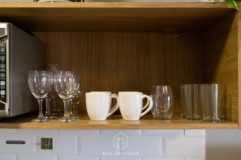 Upon entering the studio, guests will have access to the kitchen, which has all the necessary utensils for a practical stay, such as a mini fridge, cooktop stove, microwave, sandwich maker, Nespresso coffee maker, among others. A balcony with a glass door, blackout curtains, and views of the region divides the spaces.