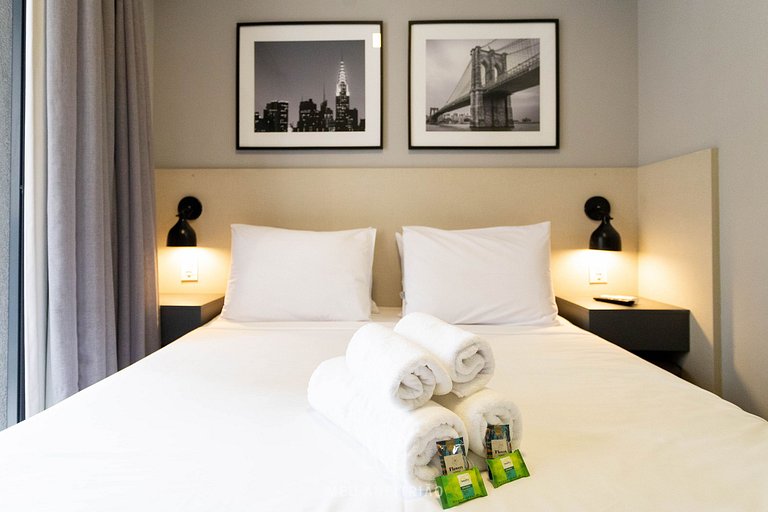 We can accommodate up to 2 people in a queen-size bed in our 23m² studio. The condominium has a complete leisure area and 24-hour concierge.