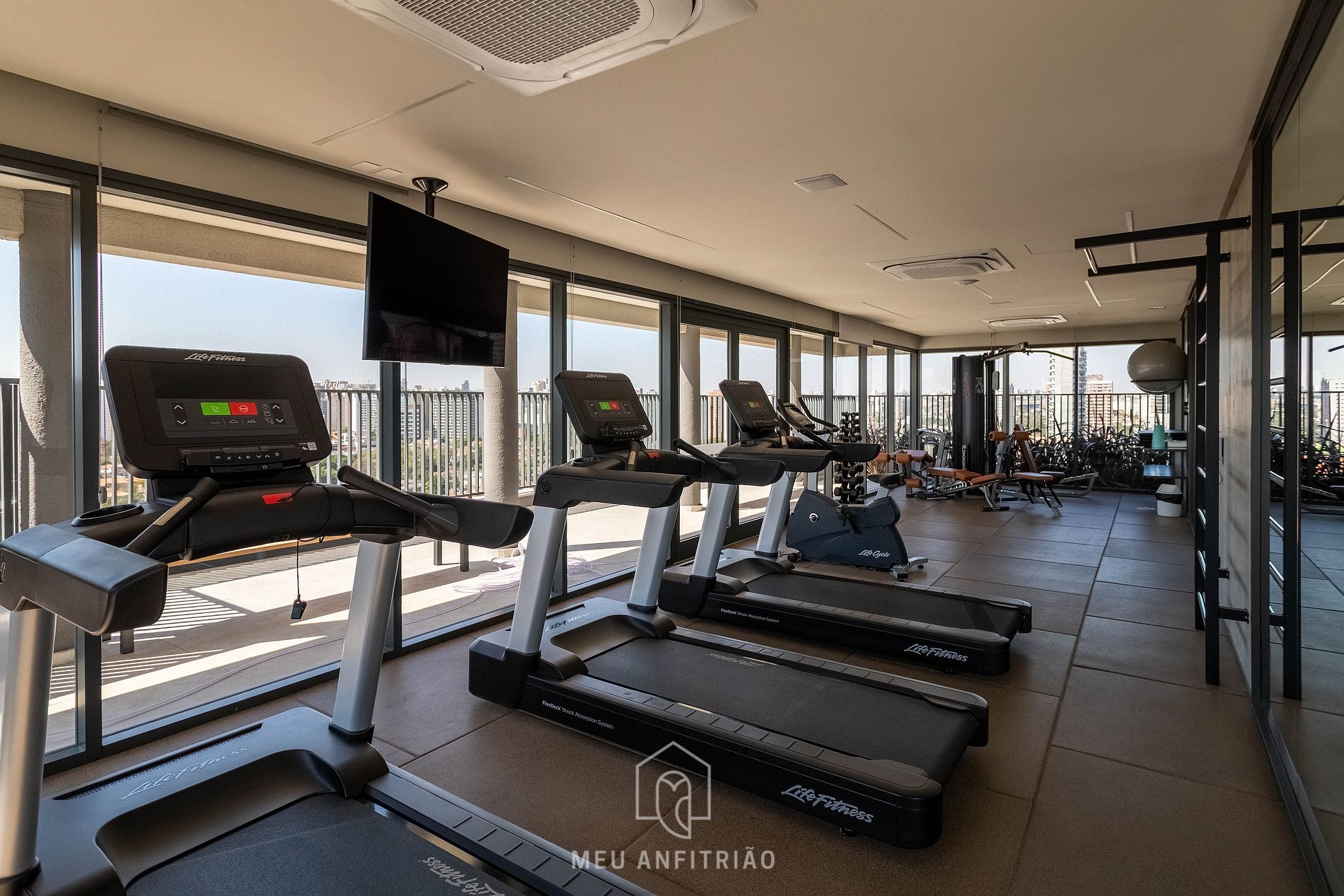 Upon entering, guests will have access to the kitchen, which has all the necessary utensils for a practical stay, such as a refrigerator, cooktop stove, microwave, blender, electric coffee maker, water filter, sandwich maker, among others. A balcony with a view of the city, blinds and glass windows divide the spaces.
