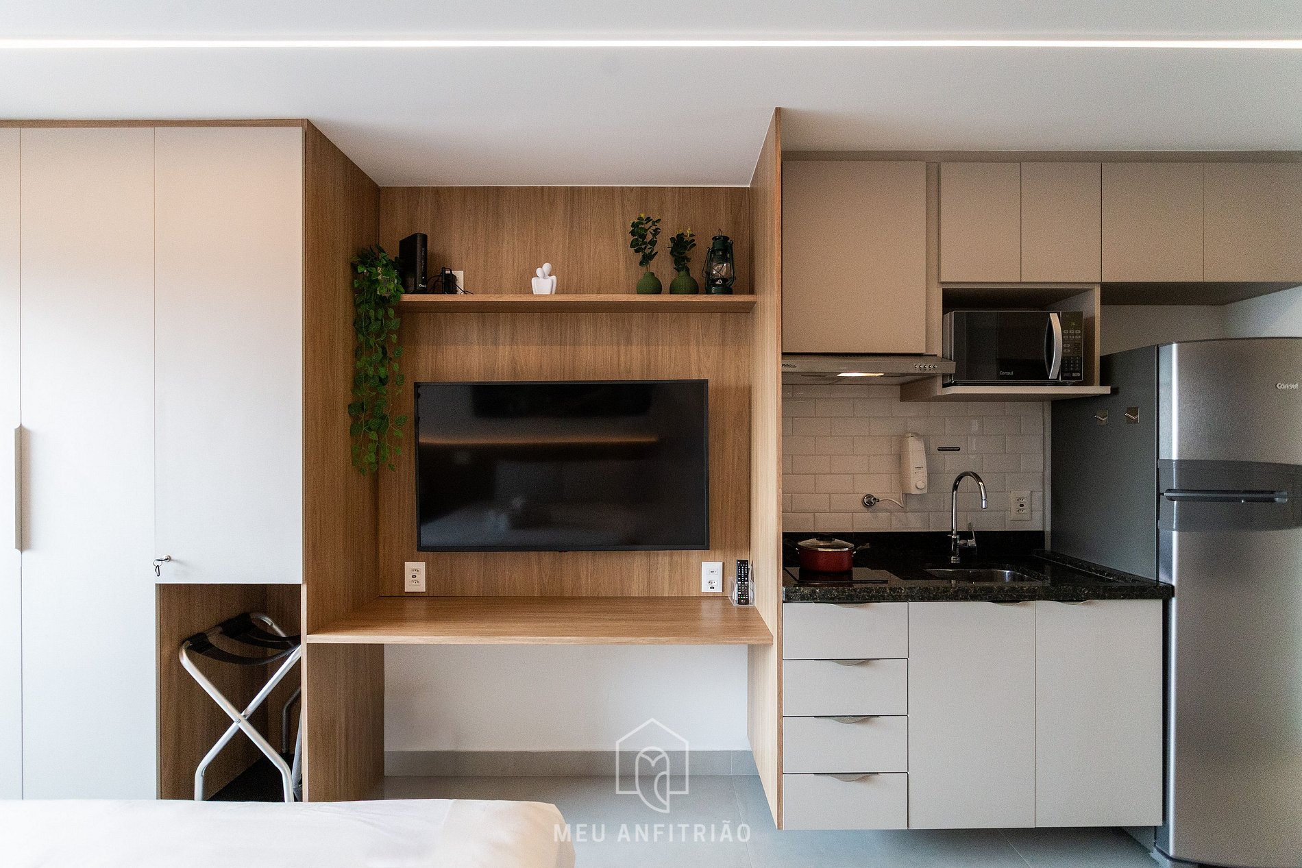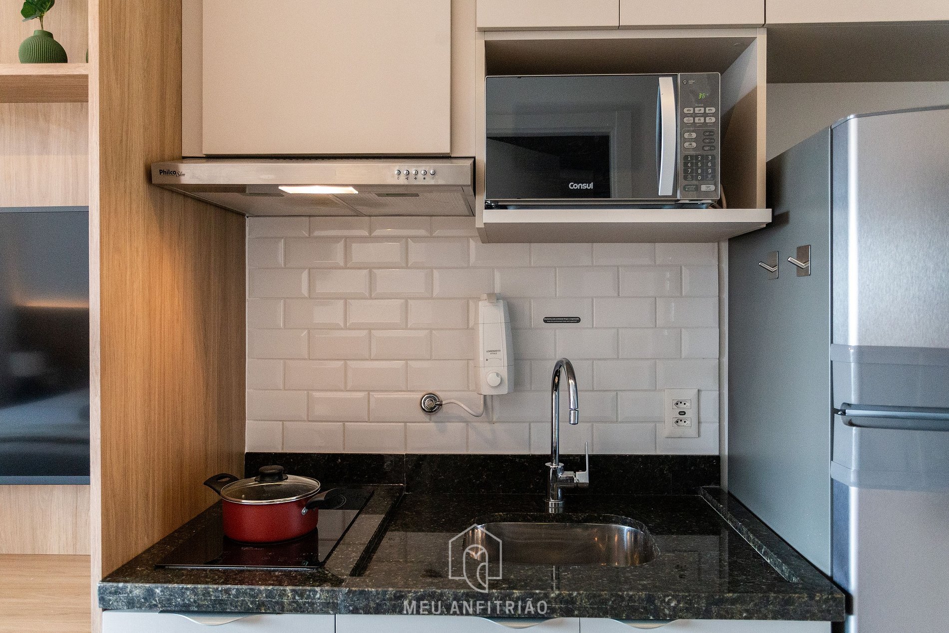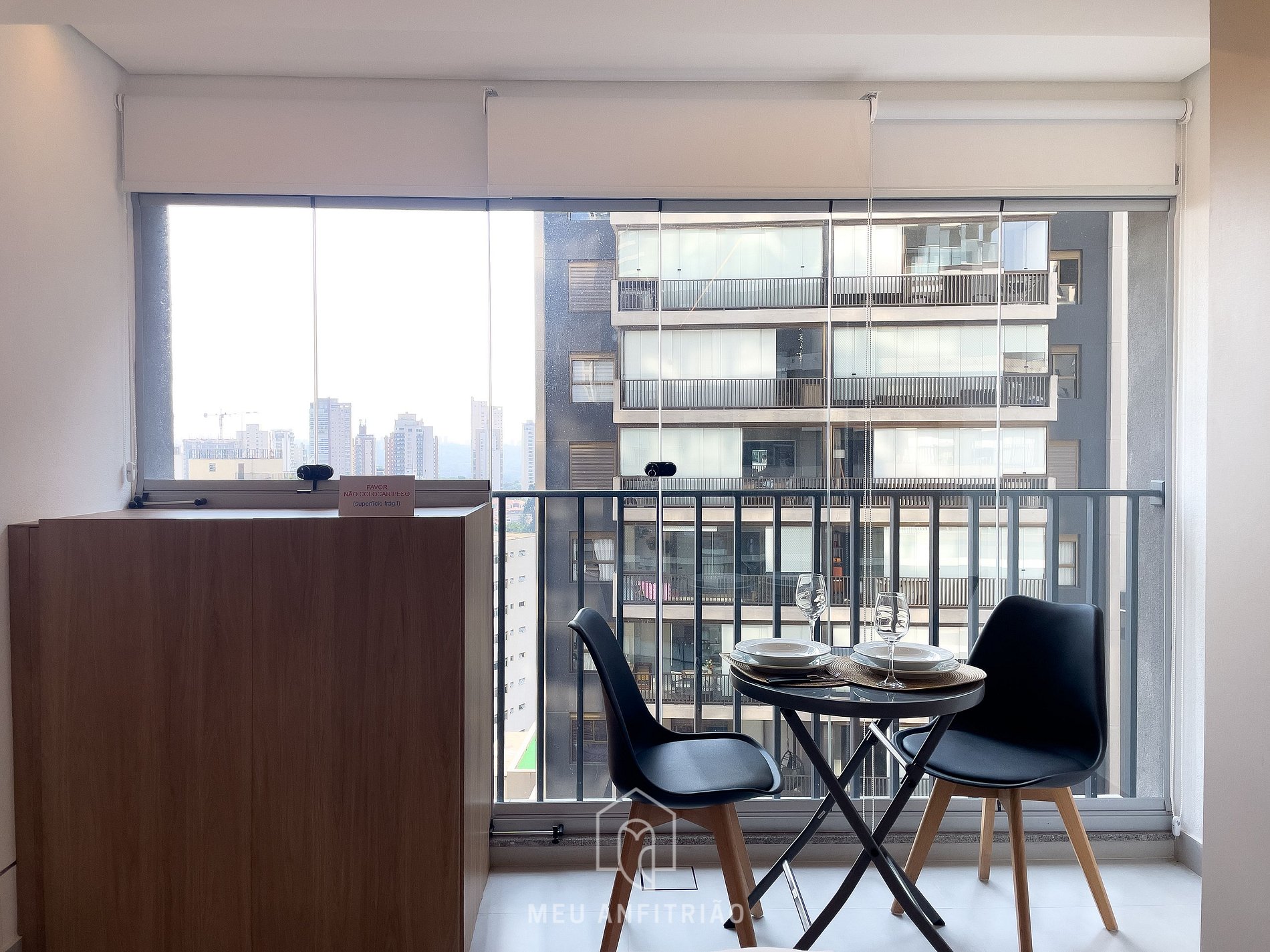 Upon entering, guests will have access to the kitchen, which has all the necessary utensils for a practical stay, such as a refrigerator, cooktop stove, microwave, hood, sandwich maker, blender, Nespresso coffee maker, among others. The balcony is integrated into the studio, and there is a table with chairs for meals and blackout blinds.