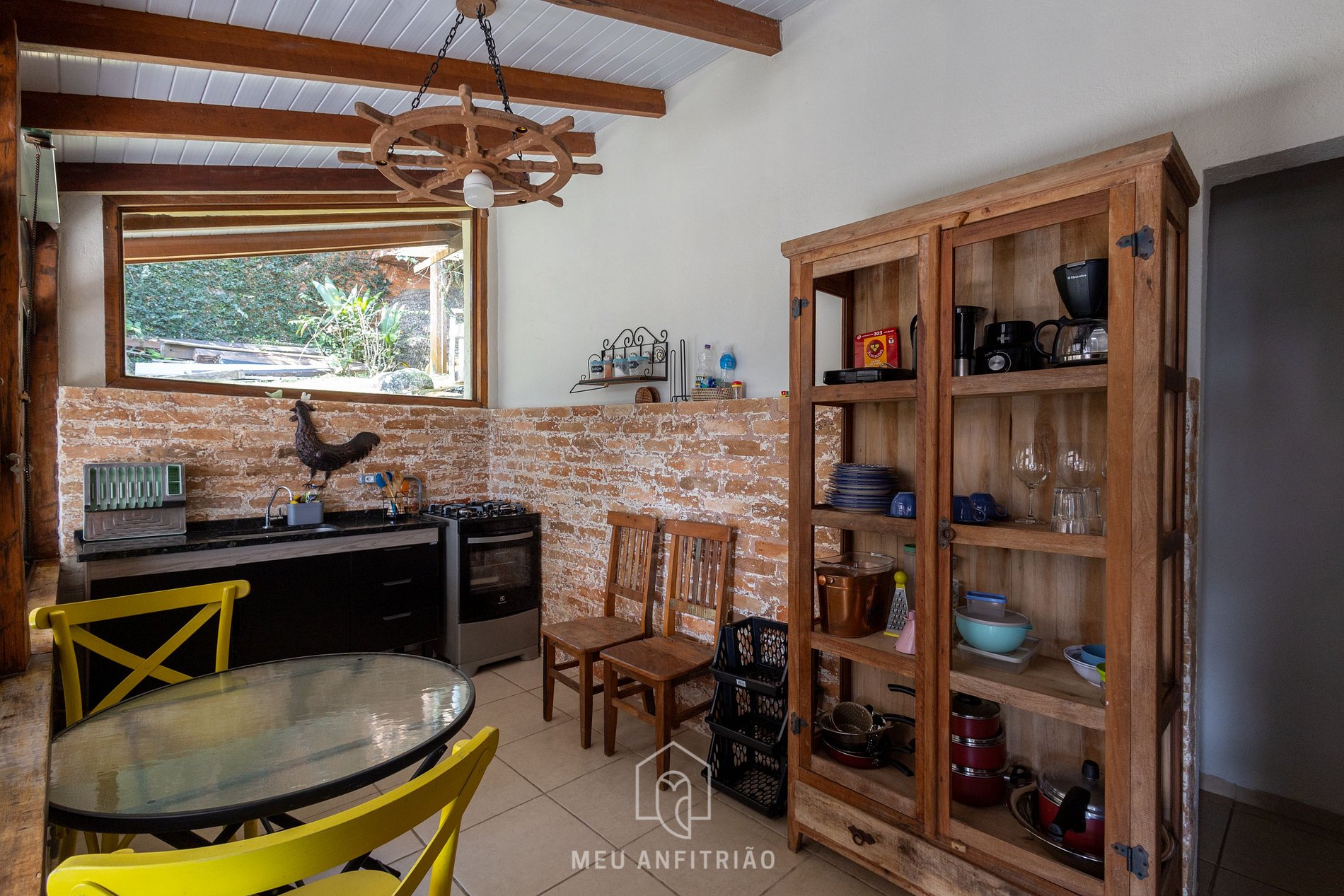 Upon entering the house, guests will find a well-lit and airy environment. In this space, there is a kitchen with all the necessary utensils for a practical stay, with a refrigerator, stove, microwave, as well as a table with chairs and a balcony with a barbecue.