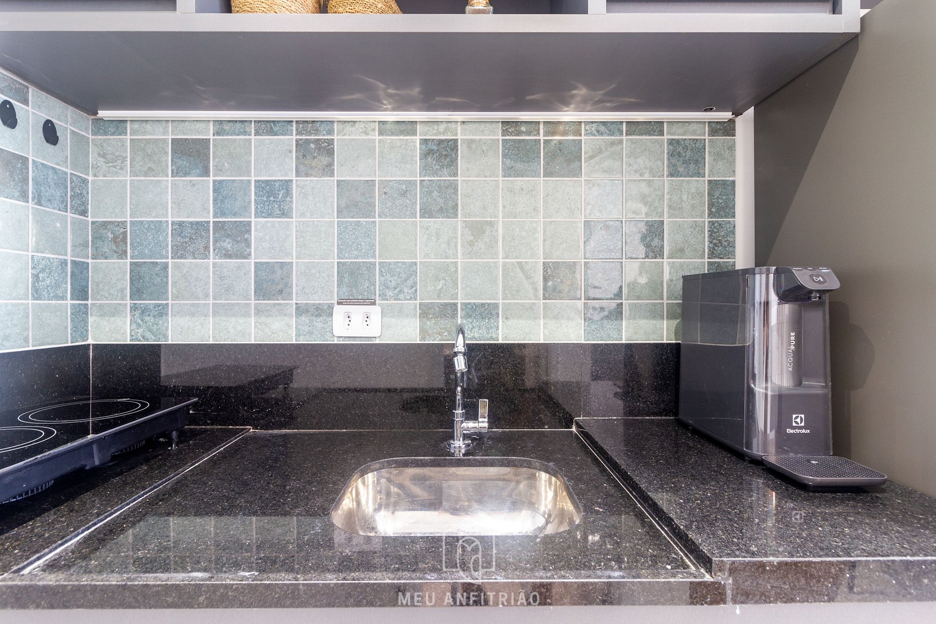 Upon entering, guests will have access to the kitchen, which has all the necessary utensils for a practical stay, such as a cooktop stove, refrigerator, microwave, electric coffee maker, sandwich maker, blender, among others. The balcony has a glass door with blackout curtains and a privileged view of Faria Lima.