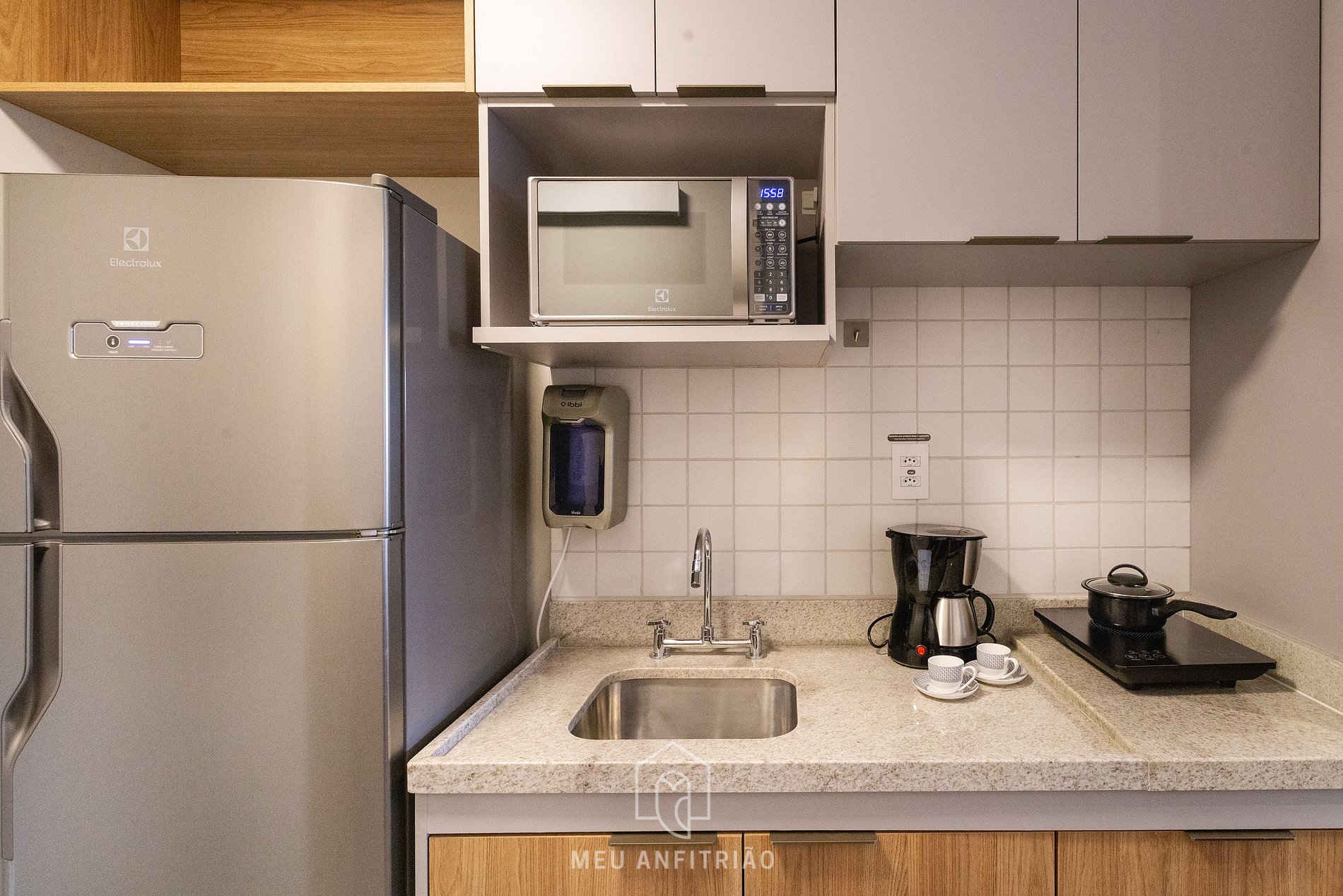 Upon entering the studio, guests will have access to the kitchen, which has all the necessary utensils for a practical stay, such as a cooktop stove, refrigerator, microwave, water filter, sandwich maker, blender, coffee maker and electric kettle, among others. The balcony is integrated into the studio and has a table with chairs for dining or a home office, blinds and a view of the city.