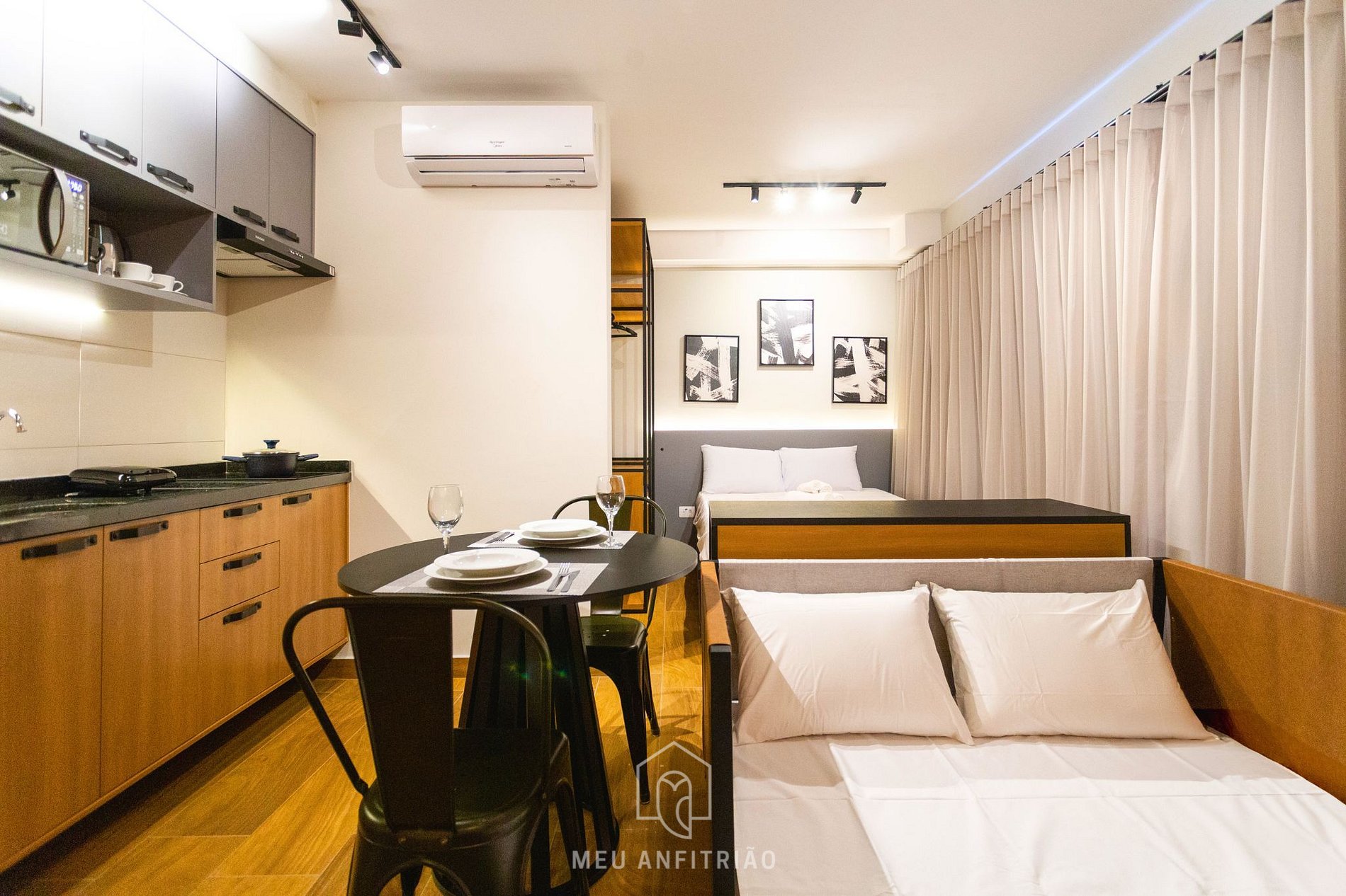 The studio accommodates up to 4 people in a queen-size bed and a double sofa bed, in a space of approximately 28m². We are in a condominium with shared laundry facilities and 24-hour doorman.