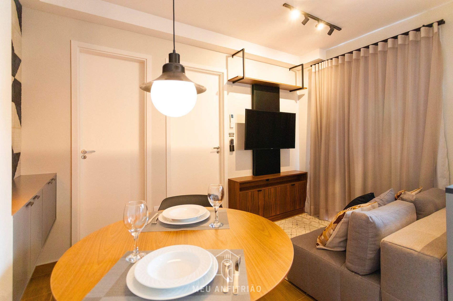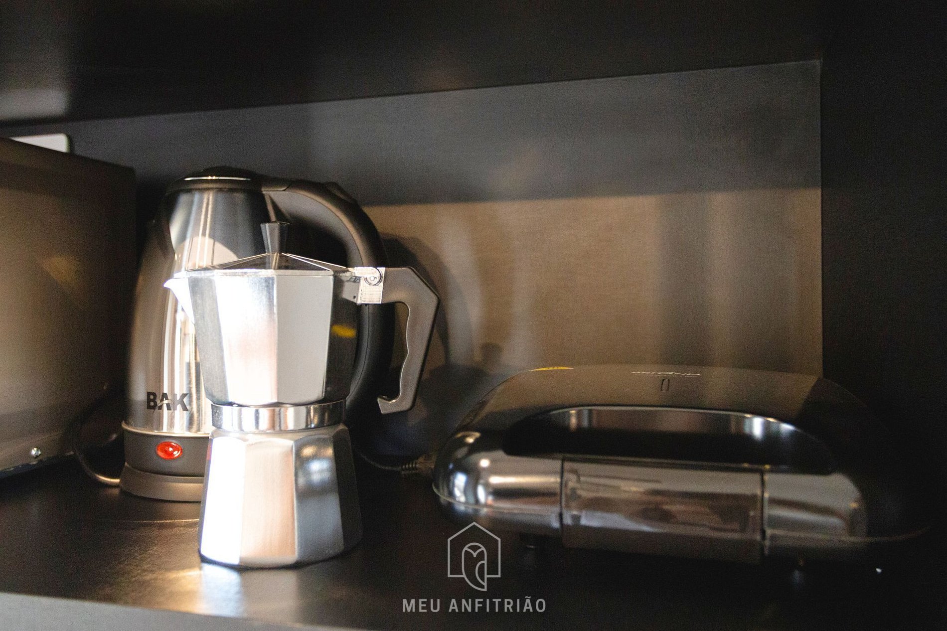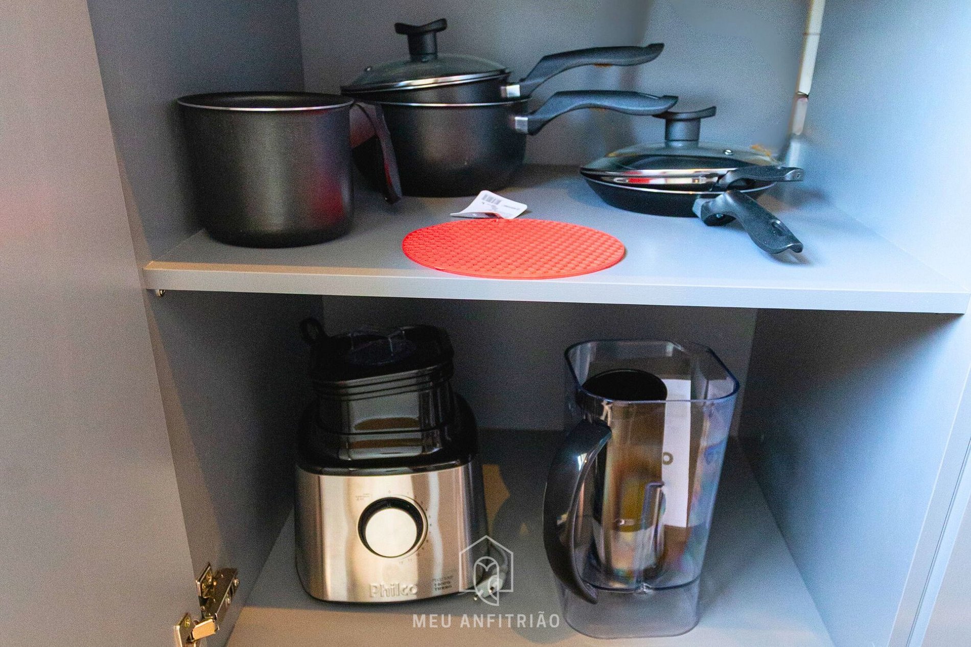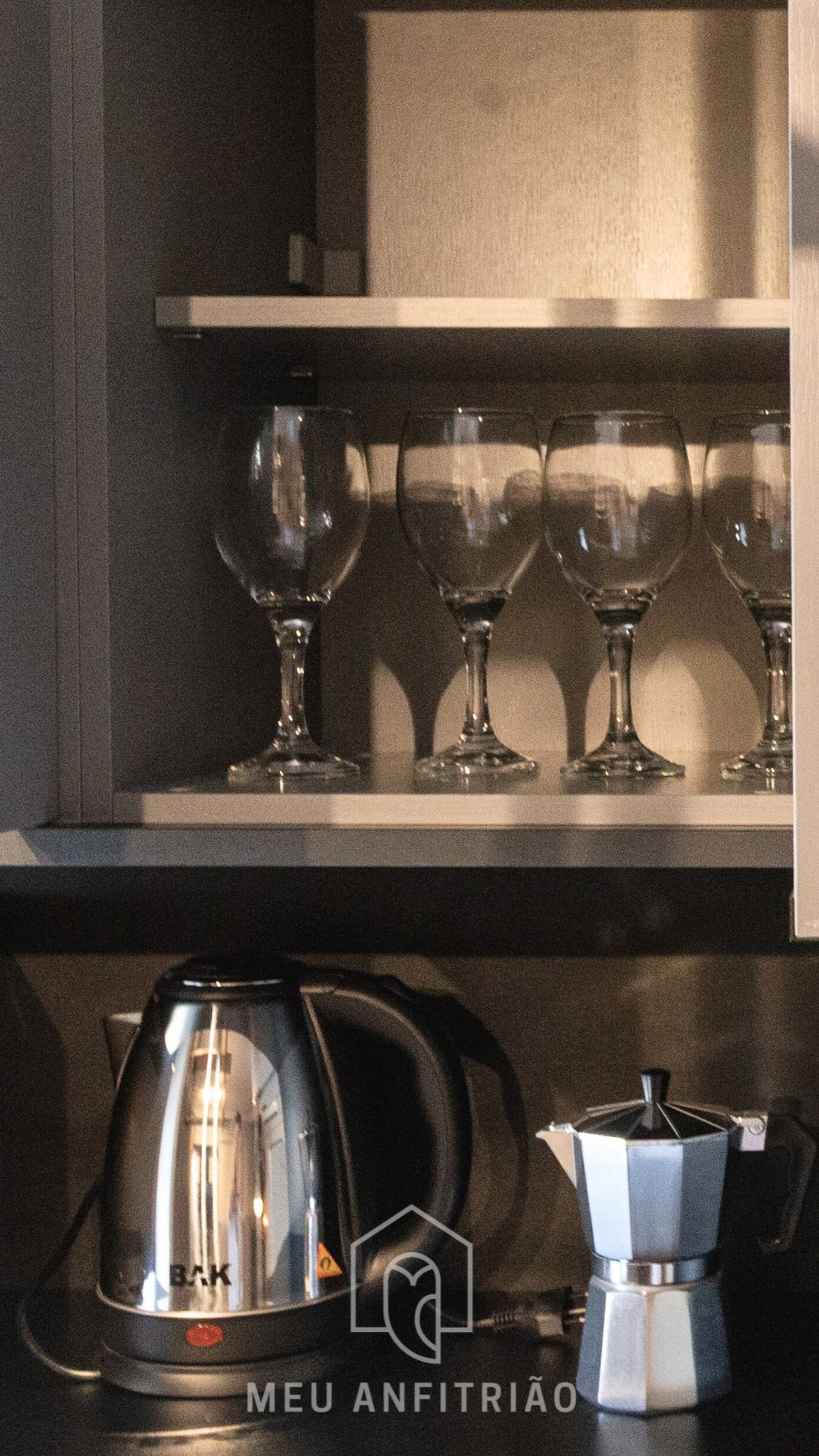 Upon entering, guests will have access to the kitchen, which has all the necessary utensils for a practical stay, such as a cooktop stove, refrigerator, microwave, extractor hood, water filter, sandwich maker, electric kettle, Italian coffee maker, among others, as well as tables with chairs for meals, a sofa and a Smart TV. The balcony has a glass door, blackout curtains and a laundry area with a sink, as well as views of the city.