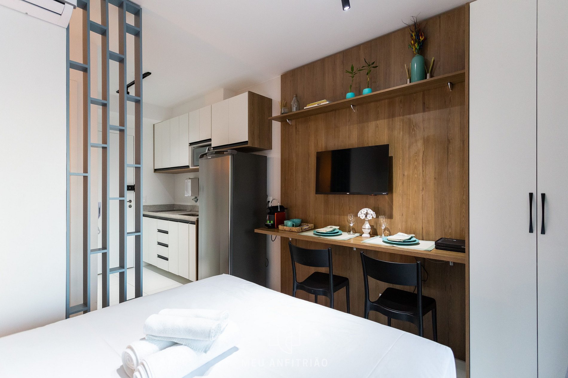 In the same environment we have a kitchen with the necessary utensils for a practical stay, bathroom, closet, dining table and homeoffice and Smart TV.