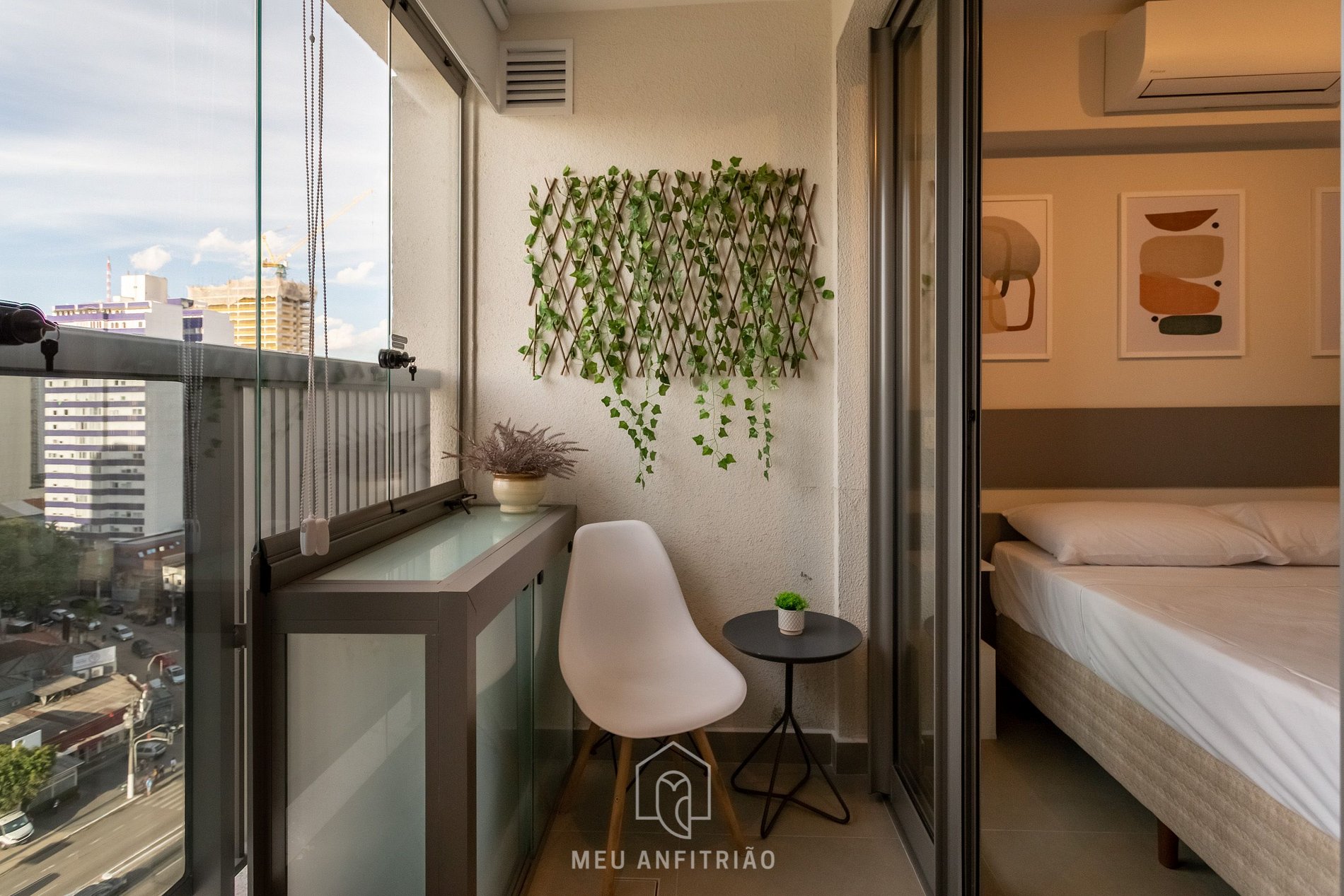 A balcony with a glass door separates the spaces. There is a table with a chair for work and another table with two chairs for the guest's use.