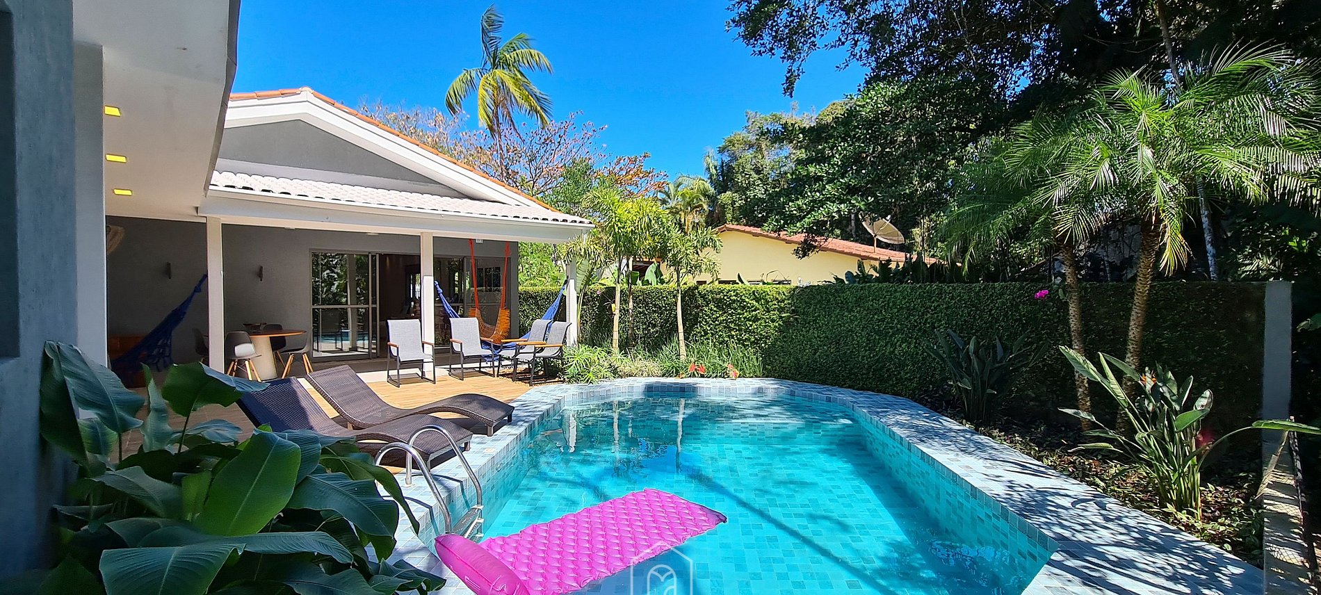 Located within a gated community near the beach, our house accommodates up to 8 people in four bedrooms, two of which are suites. We have a gourmet area with a barbecue, hot tub, and swimming pool.