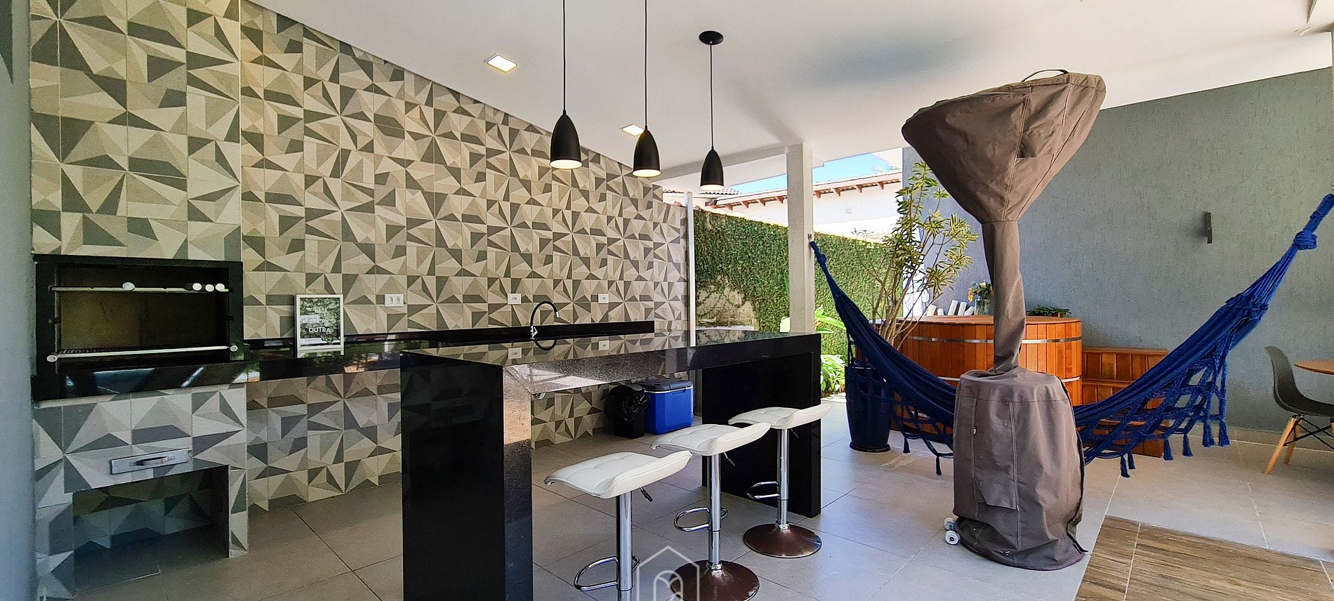 From the living room, it is possible to access the external area, in which there is a space integrated by a swimming pool, hot tub and gourmet area with barbecue. For colder days, we have a heater.