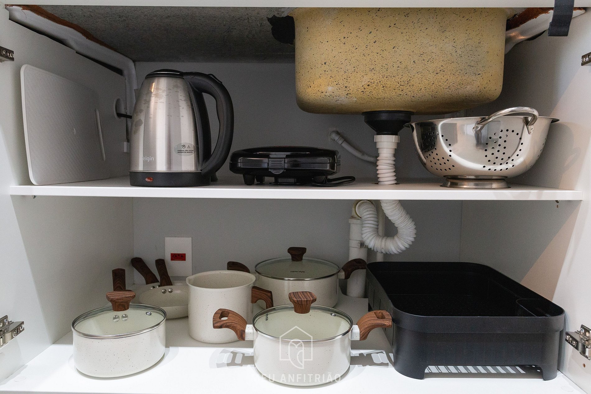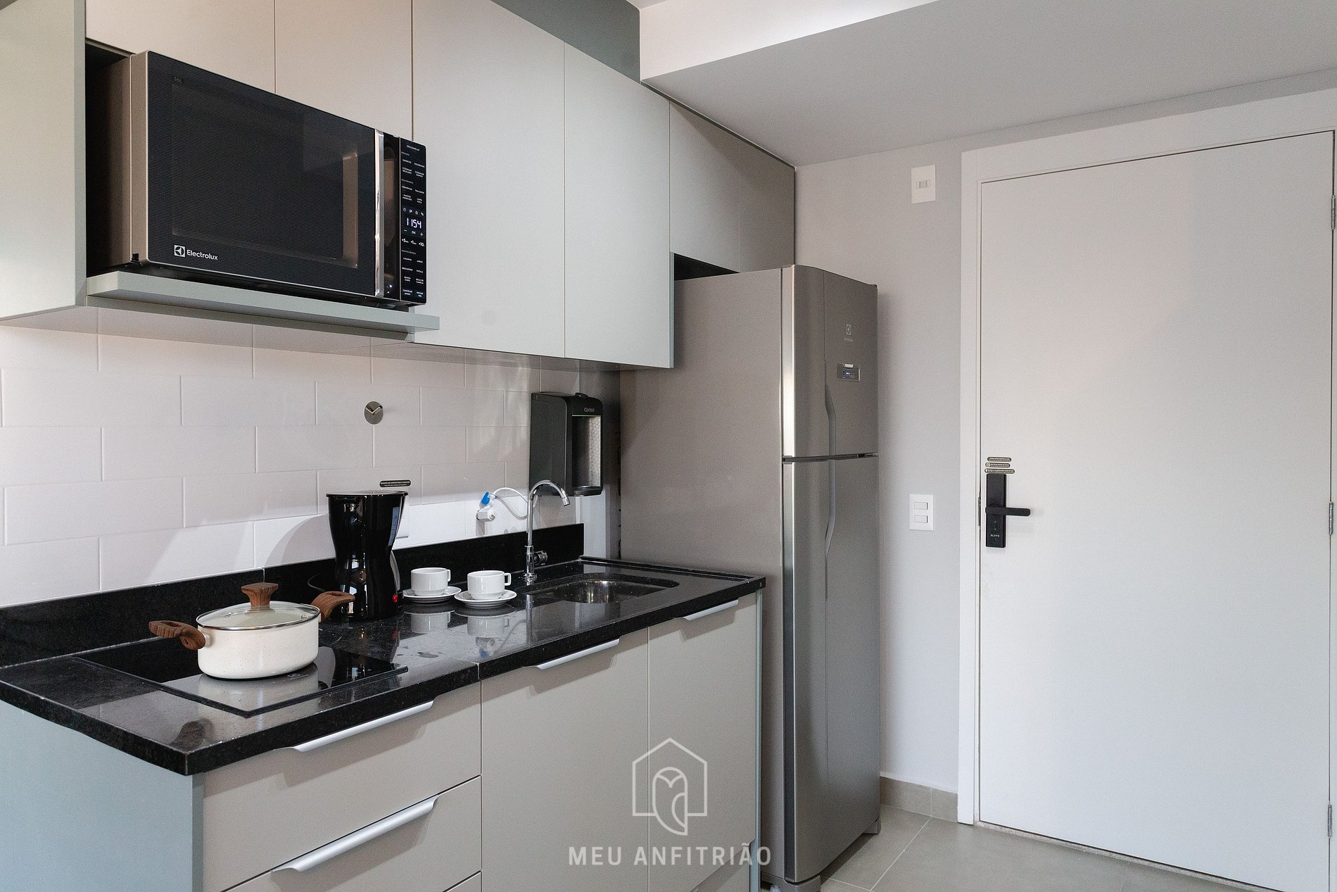 Right at the entrance to the studio, guests will find a kitchen equipped with everything they need for a practical stay: refrigerator, cooktop, microwave, sandwich maker, blender, coffee maker and electric kettle, water filter, among others.