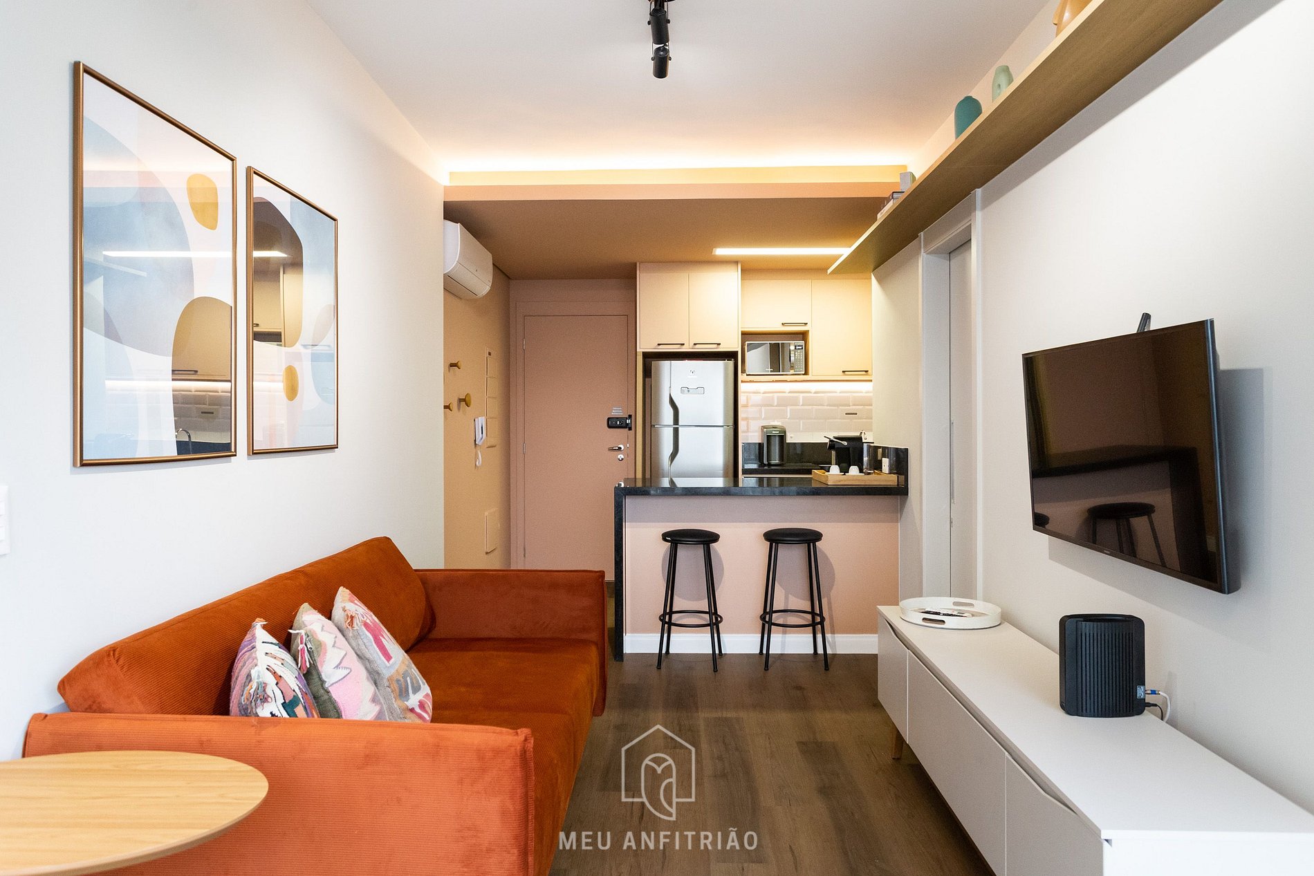 - Living room: integrated with an open concept, it offers a sofa, Smart TV, dining table, and a desk area, ideal for those who need to work from home.