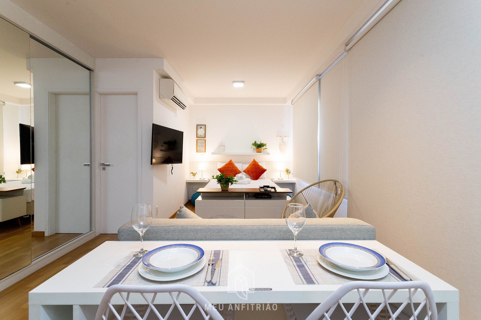 Located in a condominium with 24-hour in person concierge and leisure infrastructure, our open-concept studio accommodates up to 2 people in a double bed and is a great option for those looking for practicality and comfort. It has a living room, airy balcony, swimming pool and gym.