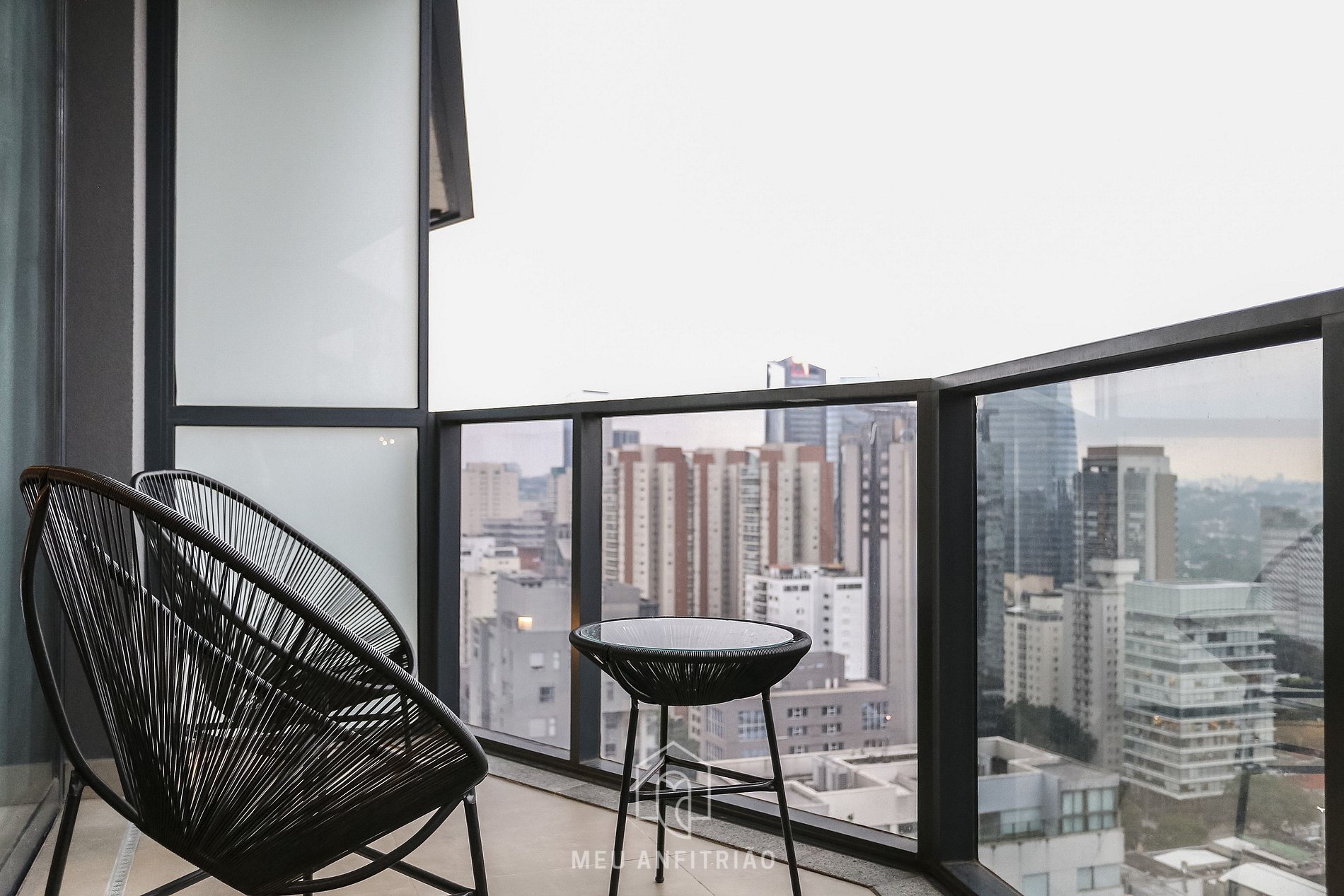 In the same space, we have the living room, which has a sofa and a rotating Smart TV with cable channels that can also be used in the bedroom. The balcony has a glass door with soundproofing, blackout curtains, chairs and a wide view of the city, since we are on the 23rd floor.