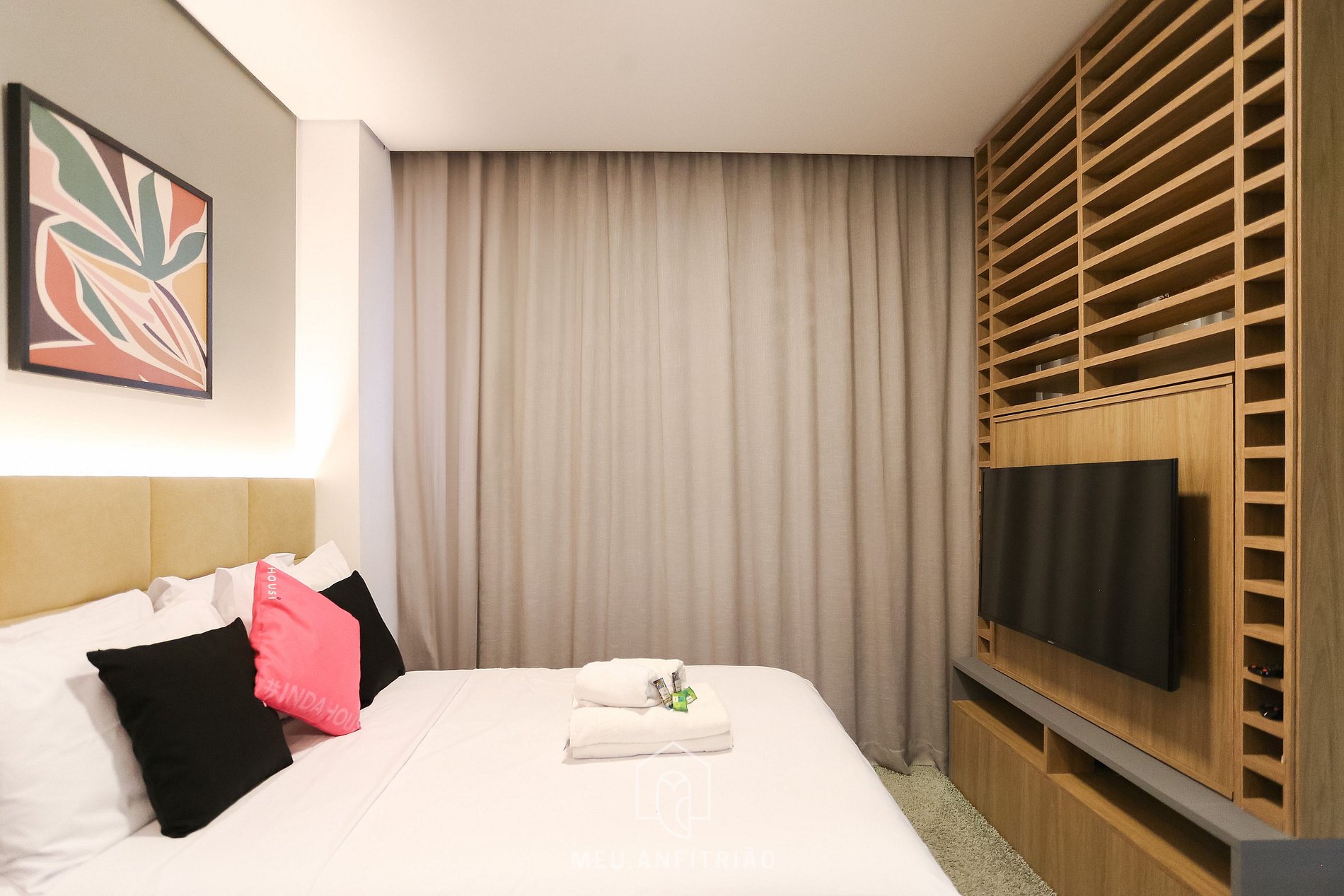 The studio accommodates up to 2 people in a double bed, with a large space of approximately 43m². The condominium has a complete leisure area and 24-hour doorman.