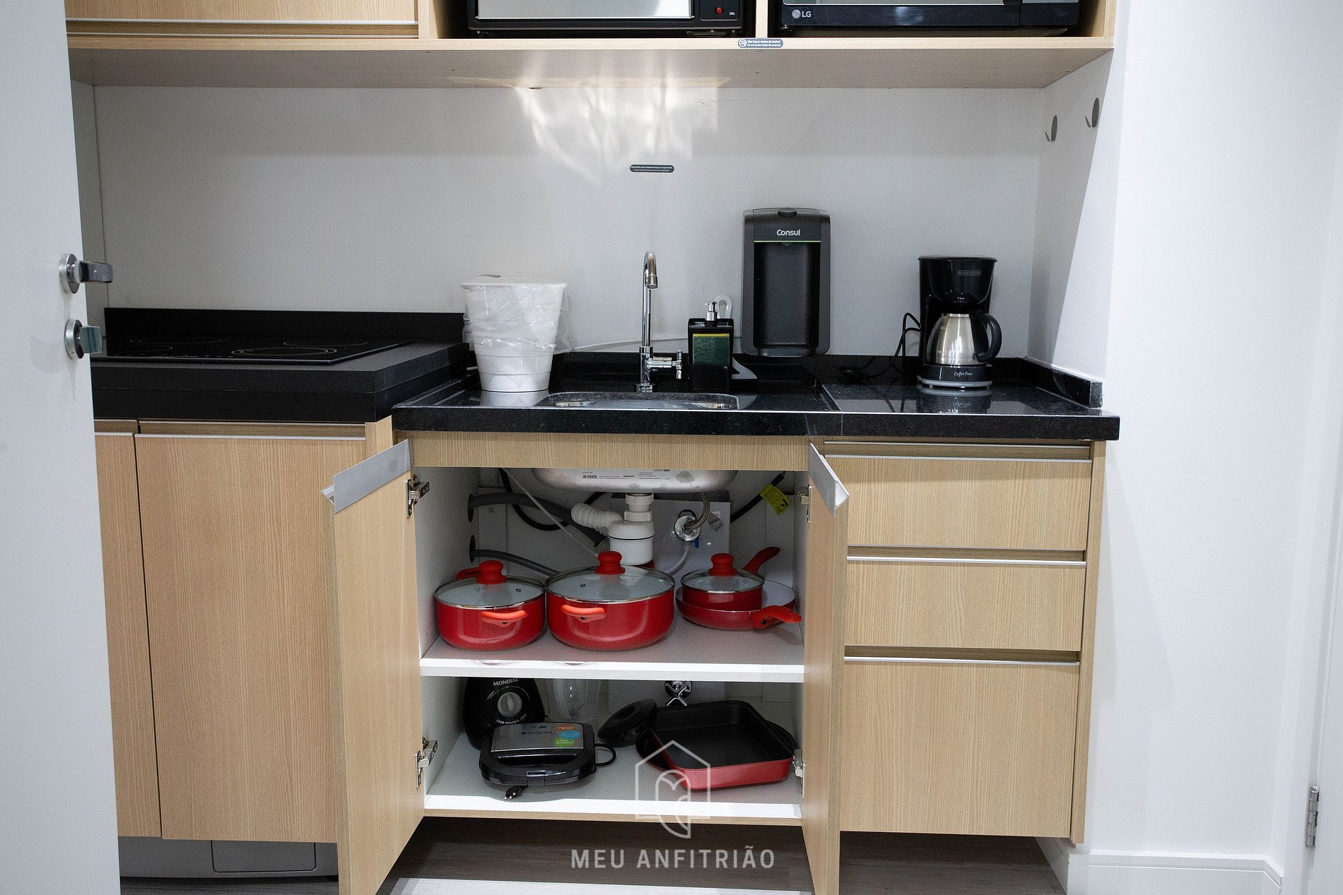 In the same environment we have a kitchen with all the necessary utensils for a practical stay with microwave, refrigerator, cooktop, toaster oven, coffee maker, water filter, etc. In addition, we have a bathroom, closet, dining table and Smart TV.