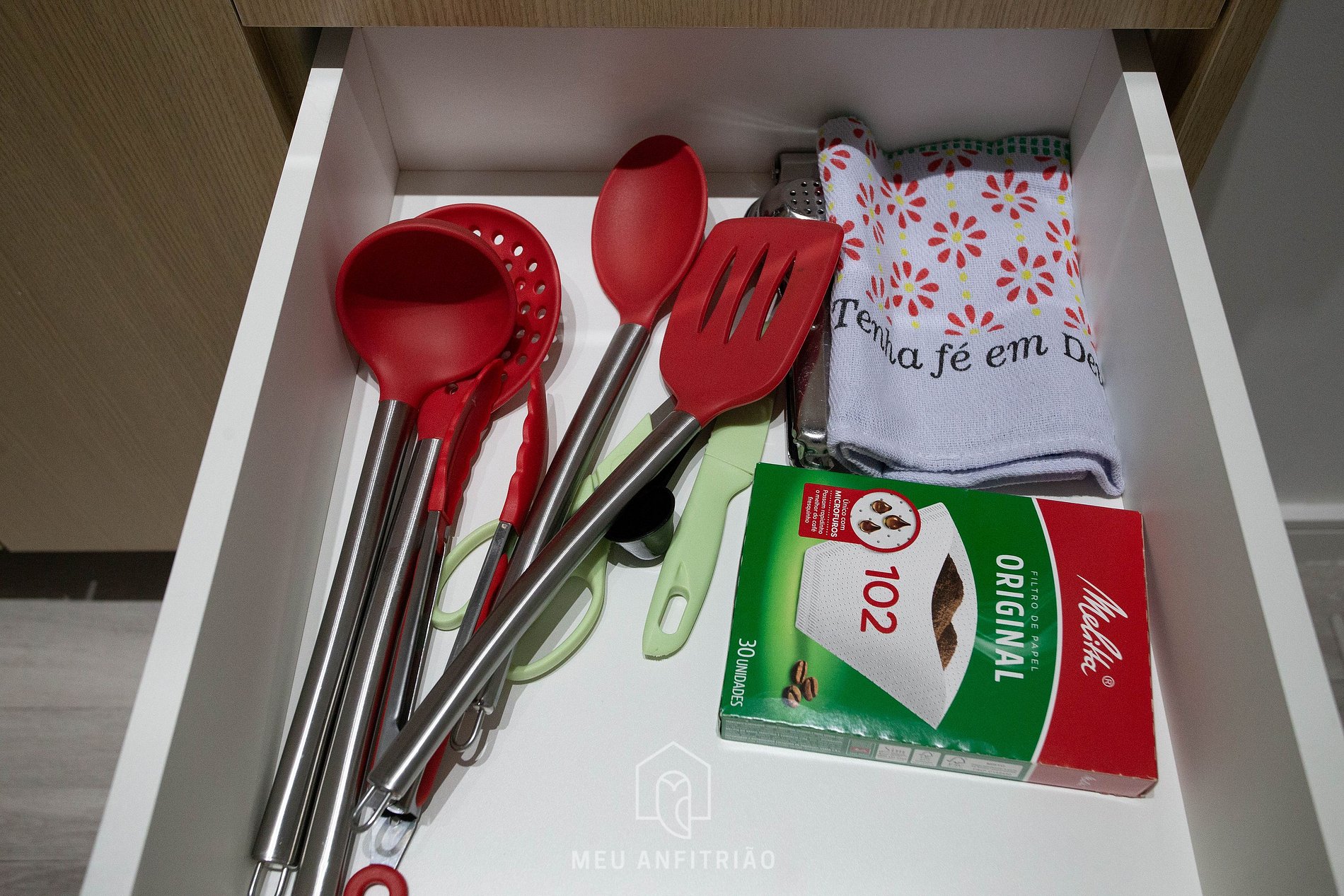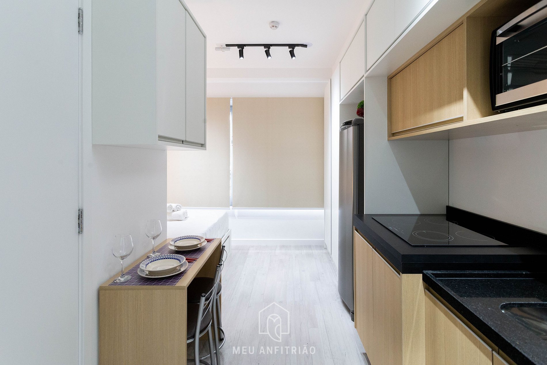 In the same environment we have a kitchen with all the necessary utensils for a practical stay with microwave, refrigerator, cooktop, toaster oven, coffee maker, water filter, etc. In addition, we have a bathroom, closet, dining table and Smart TV.