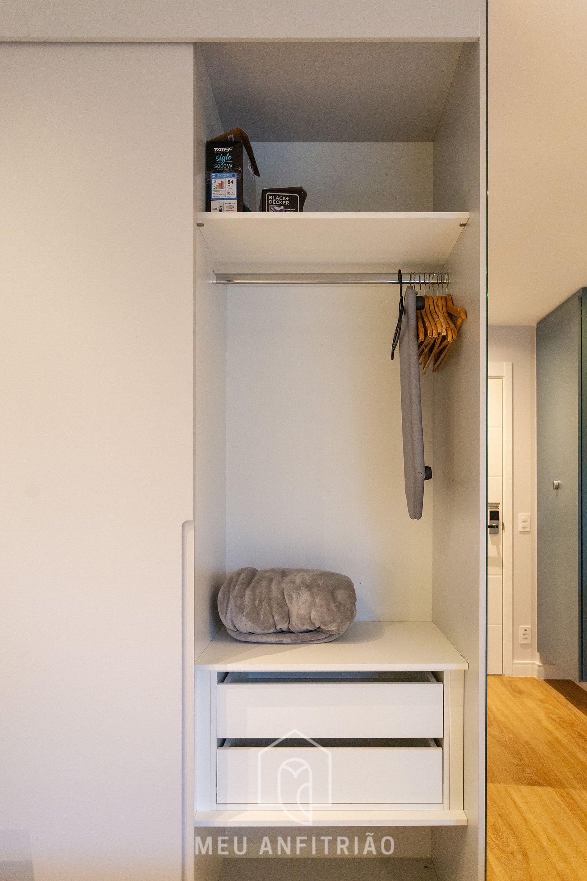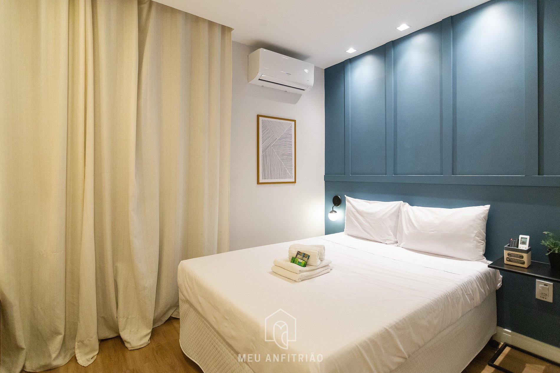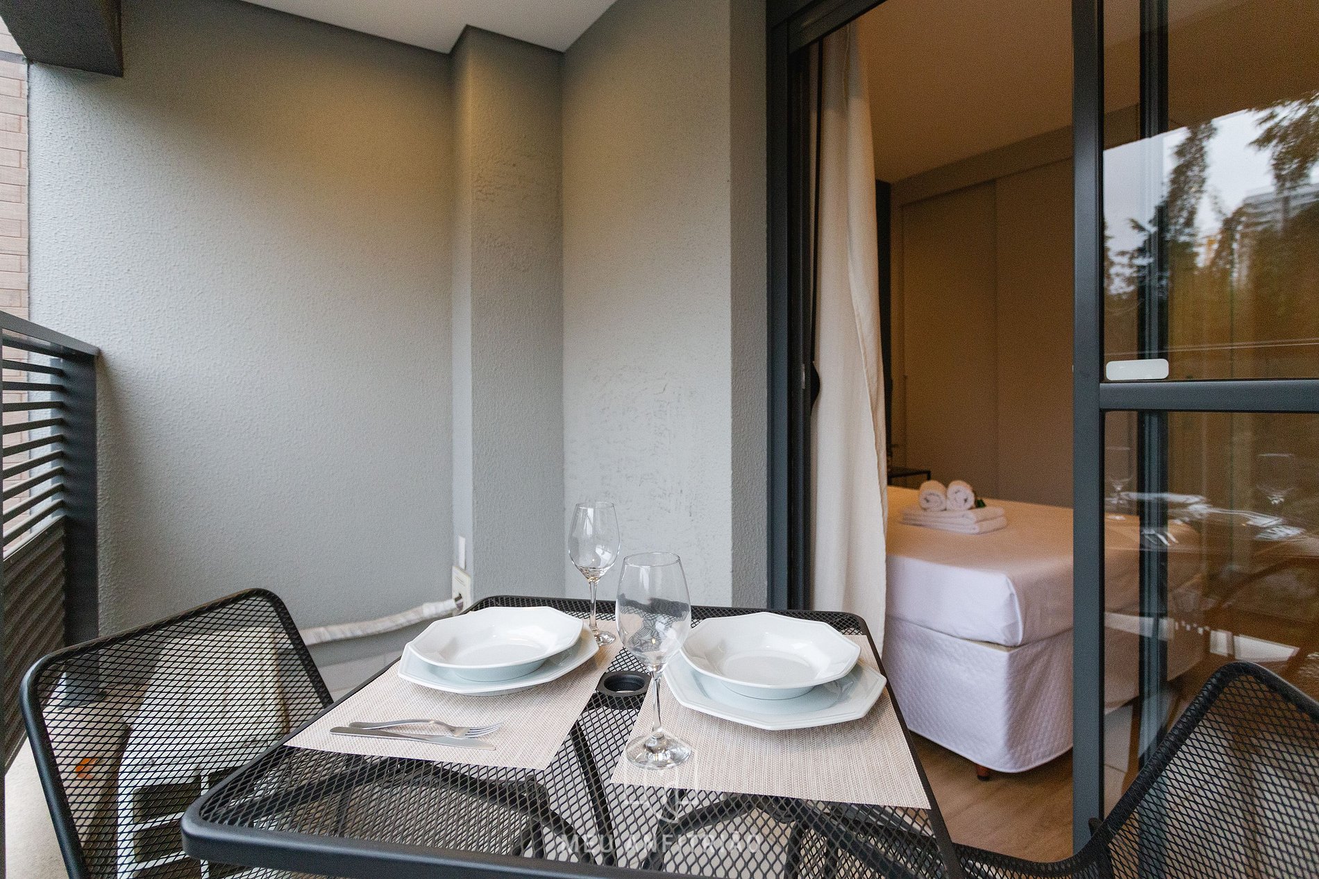 Guests will have access to the kitchen, which has the ideal utensils for a functional stay, such as a cooktop stove, refrigerator, microwave, water filter, sandwich maker, mixer, Dolce Gusto coffee maker, electric kettle, hood, electric oven, among others. The balcony has a view of the trees and a table with chairs for meals, in addition to being separated from the studio area by a soundproof glass door and blackout curtains.