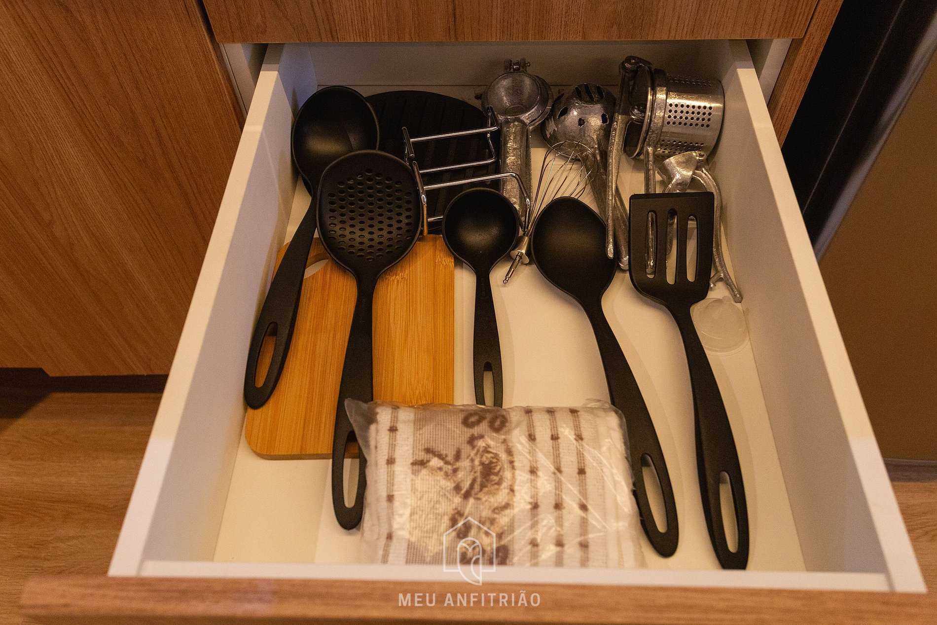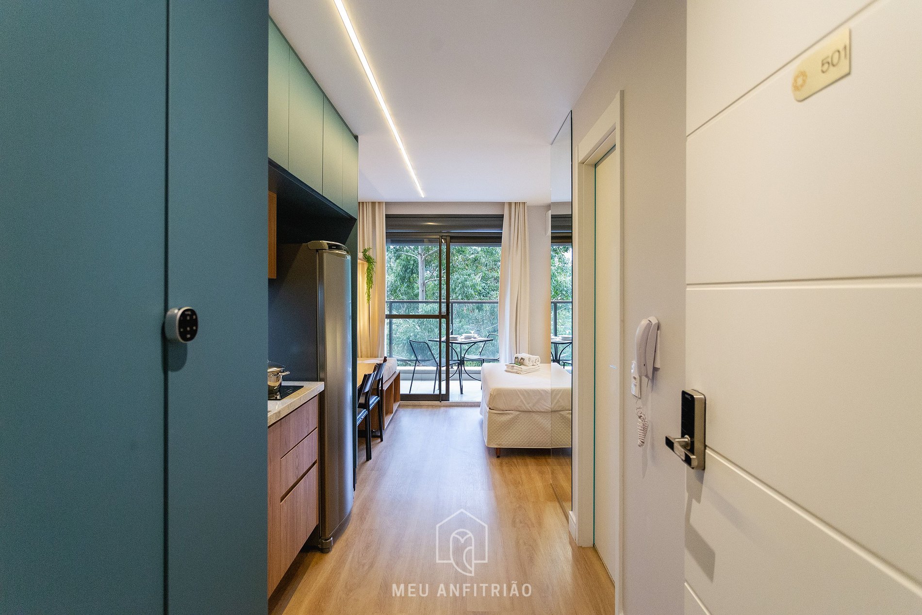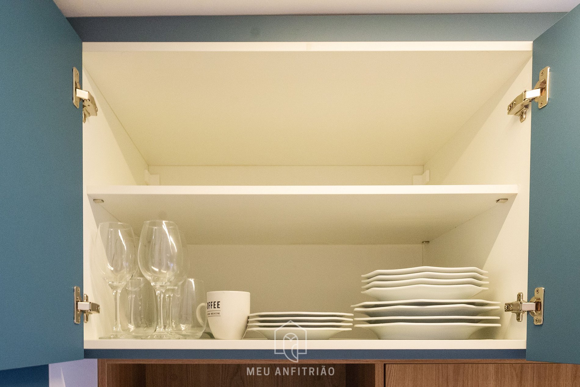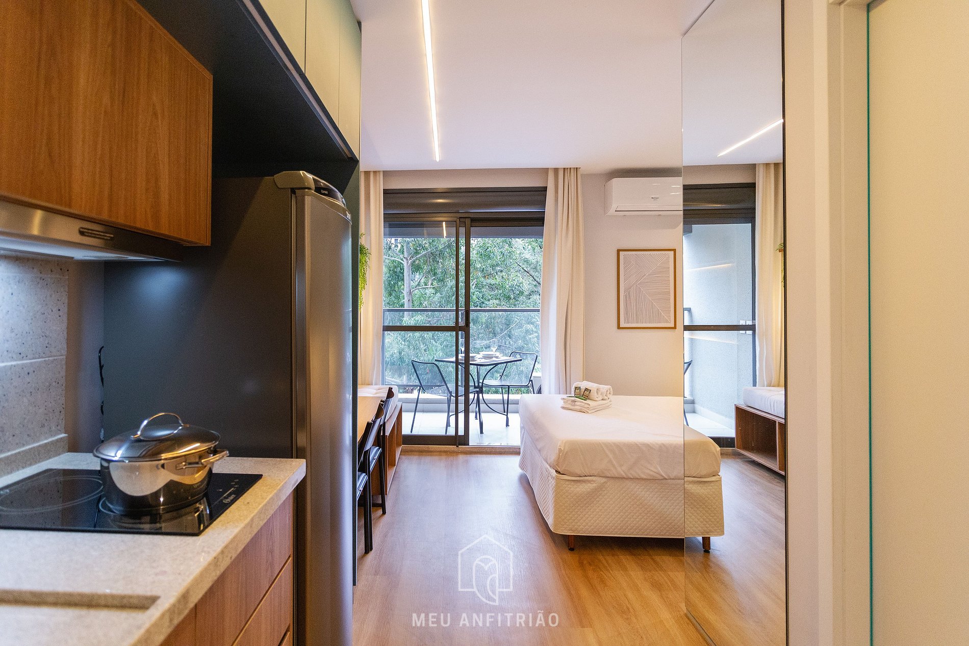 Guests will have access to the kitchen, which has the ideal utensils for a functional stay, such as a cooktop stove, refrigerator, microwave, water filter, sandwich maker, mixer, Dolce Gusto coffee maker, electric kettle, hood, electric oven, among others. The balcony has a view of the trees and a table with chairs for meals, in addition to being separated from the studio area by a soundproof glass door and blackout curtains.