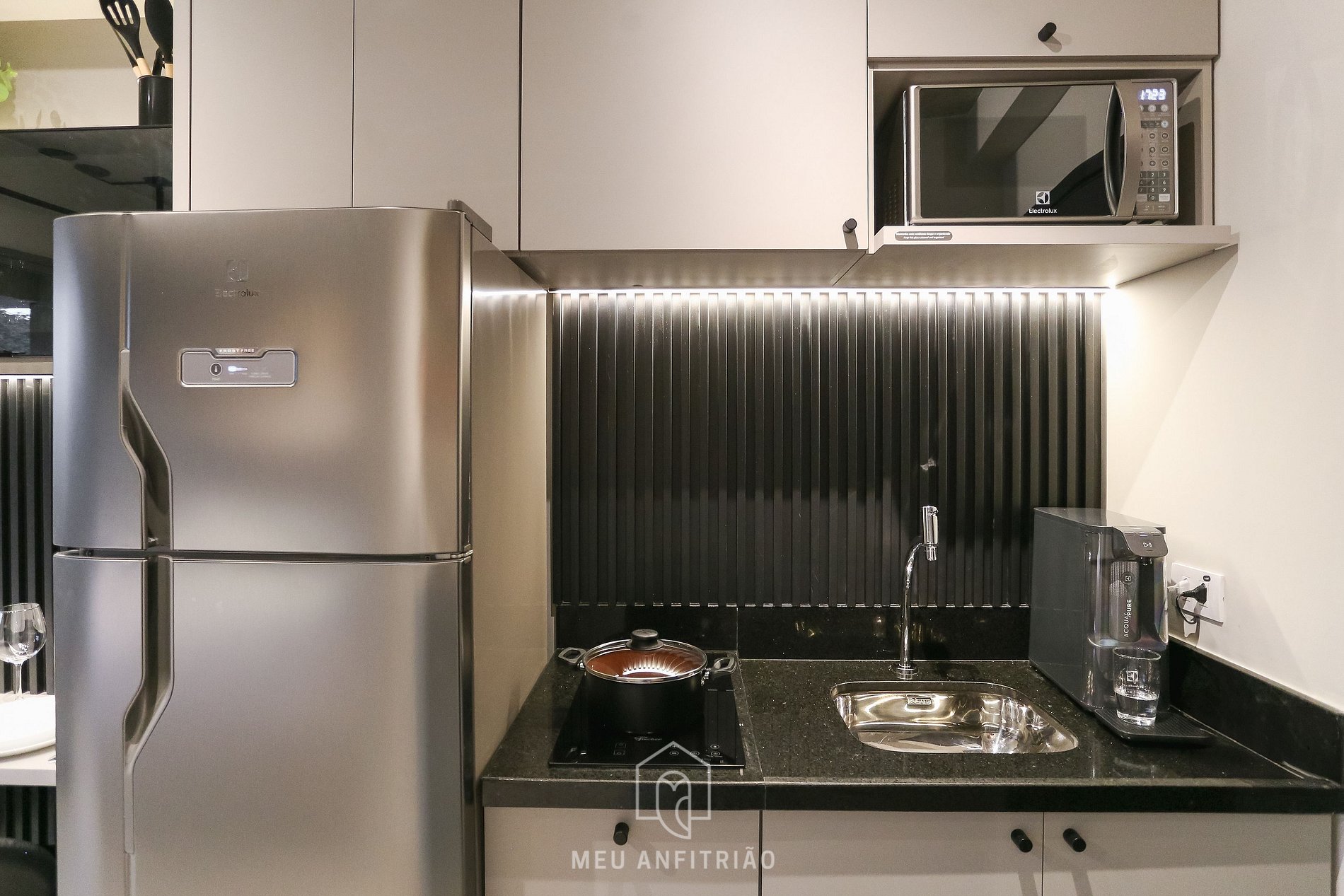 Upon entering, guests will have access to the kitchen, which is equipped with all the necessary appliances for daily use, such as a cooktop stove, refrigerator, microwave, water filter, sandwich maker, mixer, blender, electric coffee maker and kettle, Nespresso Essenza Mini coffee maker, and more.