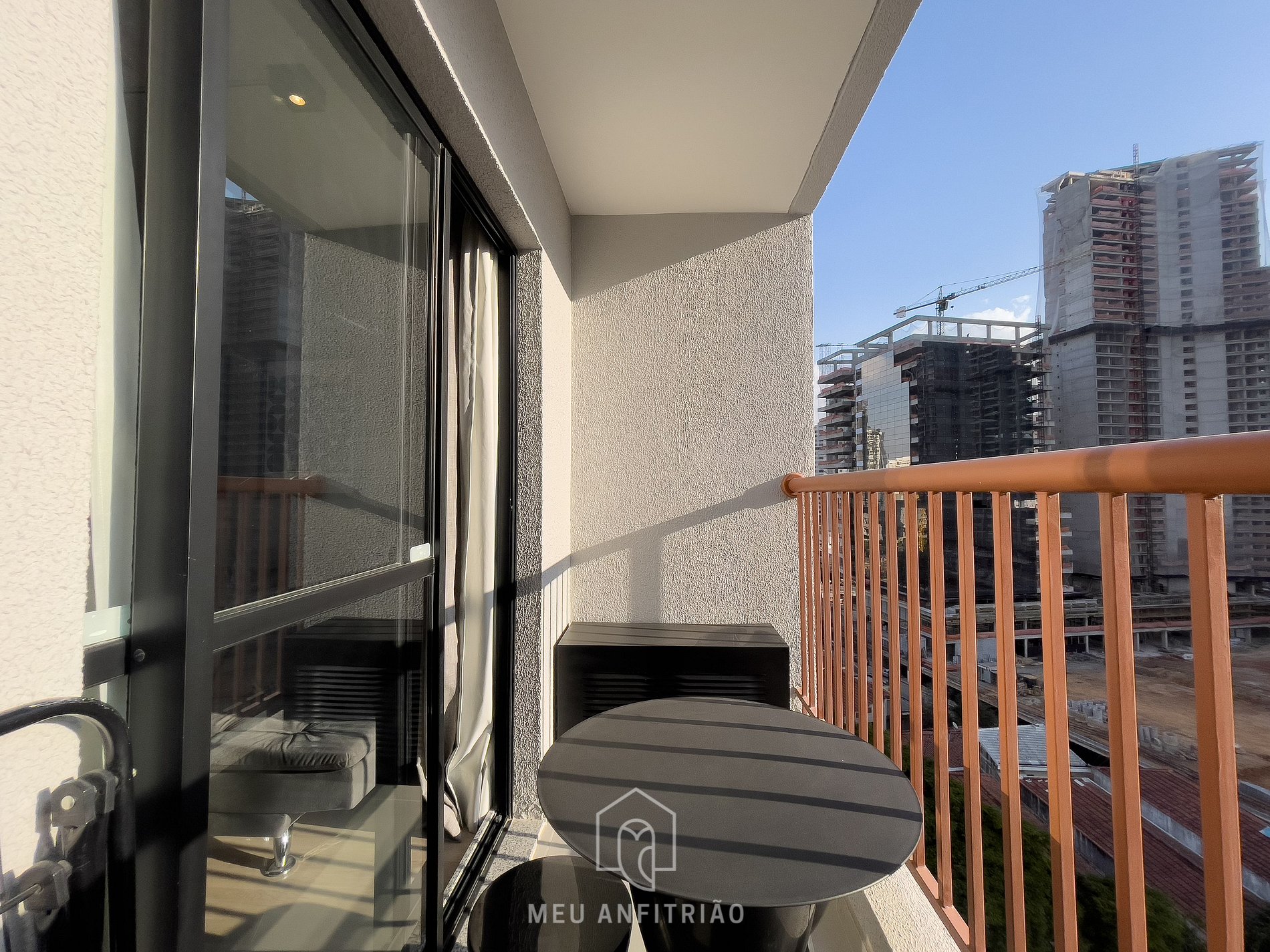 The balcony offers city views and a table with stools for dining or a home office, and is divided by a glass door and blackout curtains.