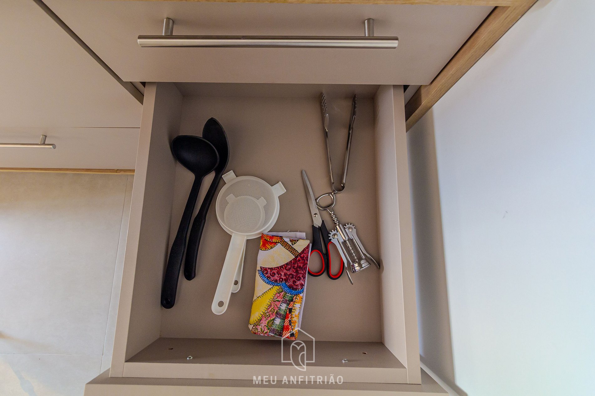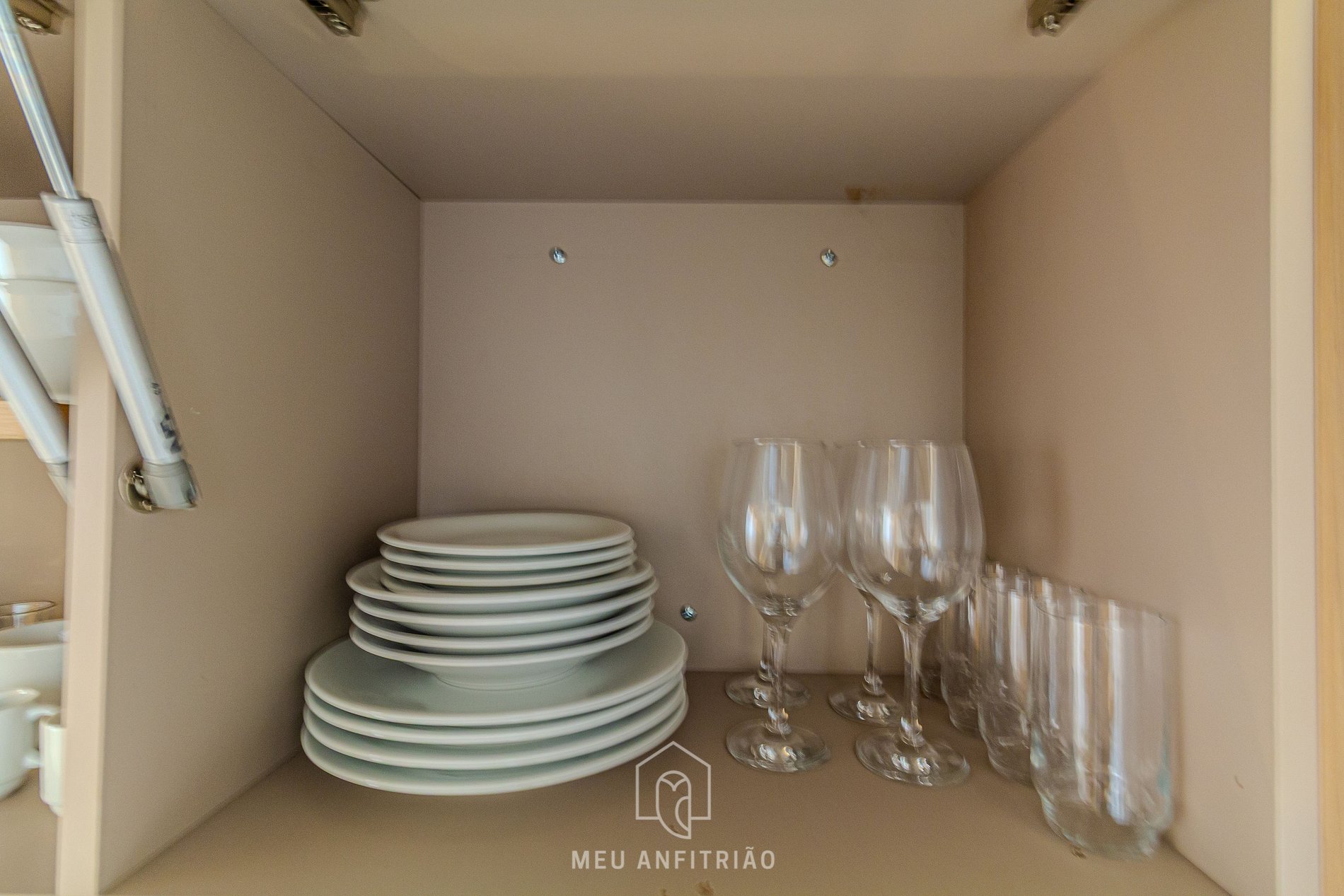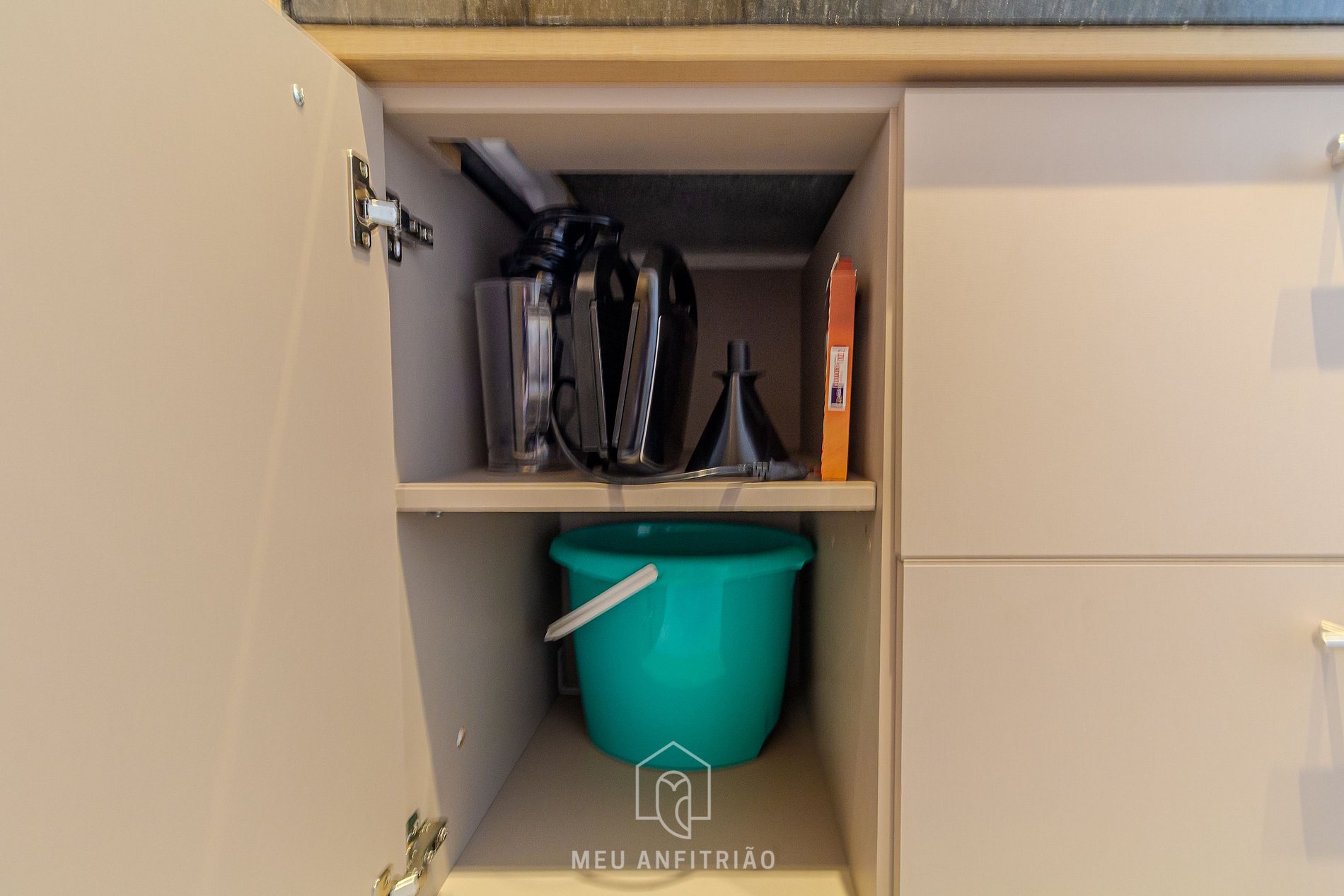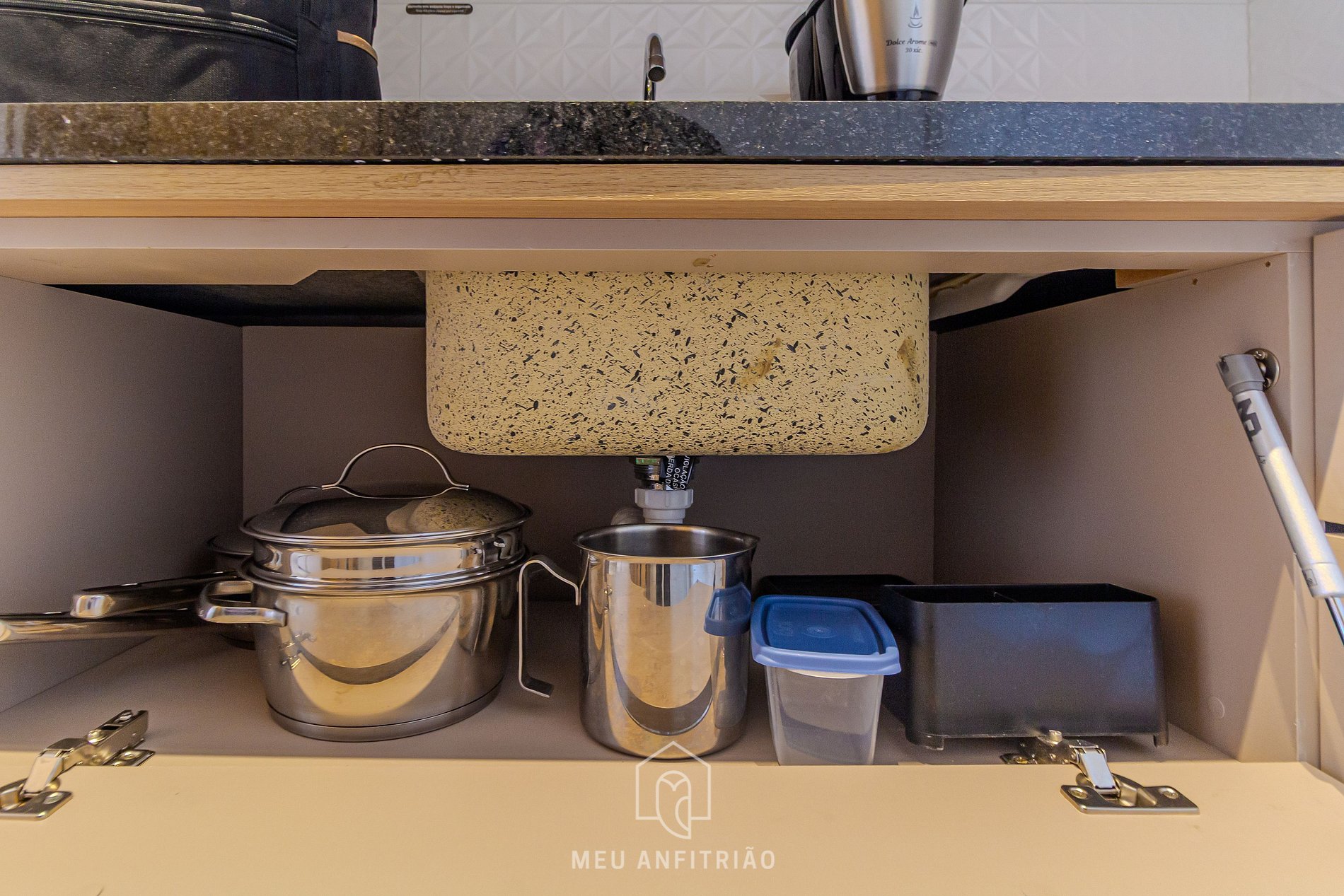 Entering the studio, the guest will find themselves in the kitchen, which has all the necessary utensils for everyday life, such as a cooktop stove, refrigerator, microwave, electric coffee maker, Nespresso Essenza Mini coffee maker, sandwich maker, mixer, among others.