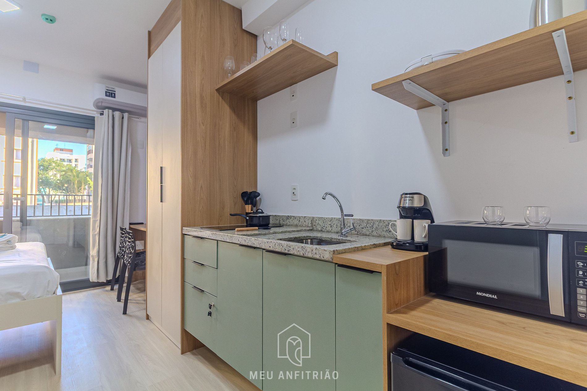 Guests enter the studio and find themselves in the kitchen, which is equipped with the most essential items for a convenient stay, such as a minibar, stovetop, microwave, sandwich maker, mixer, electric kettle, and more.