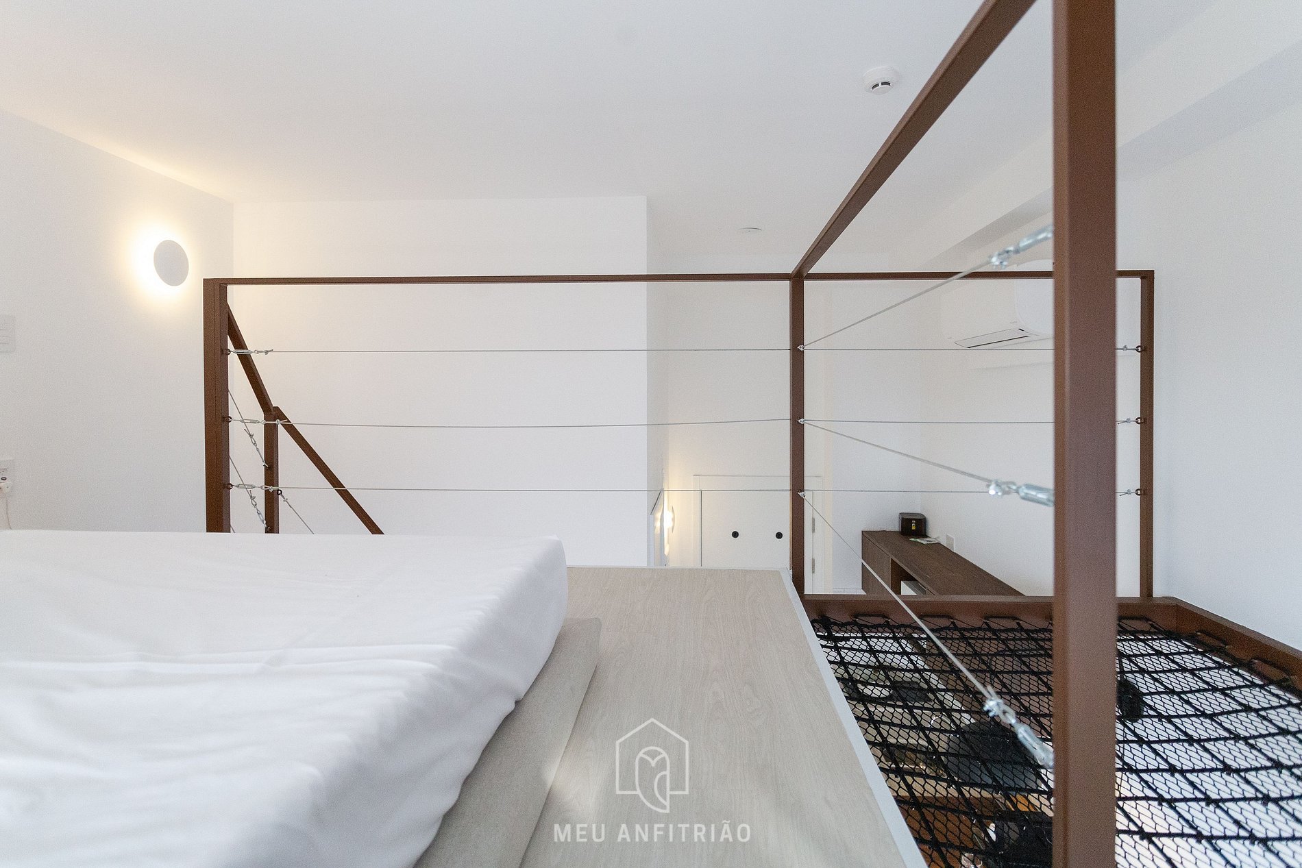 The living room offers a Smart TV, sofas, a table with chairs for dining or a home office, and a balcony with a glass door, chairs, and city views. In addition to the bed, the mezzanine also features a safe hammock with cushions.