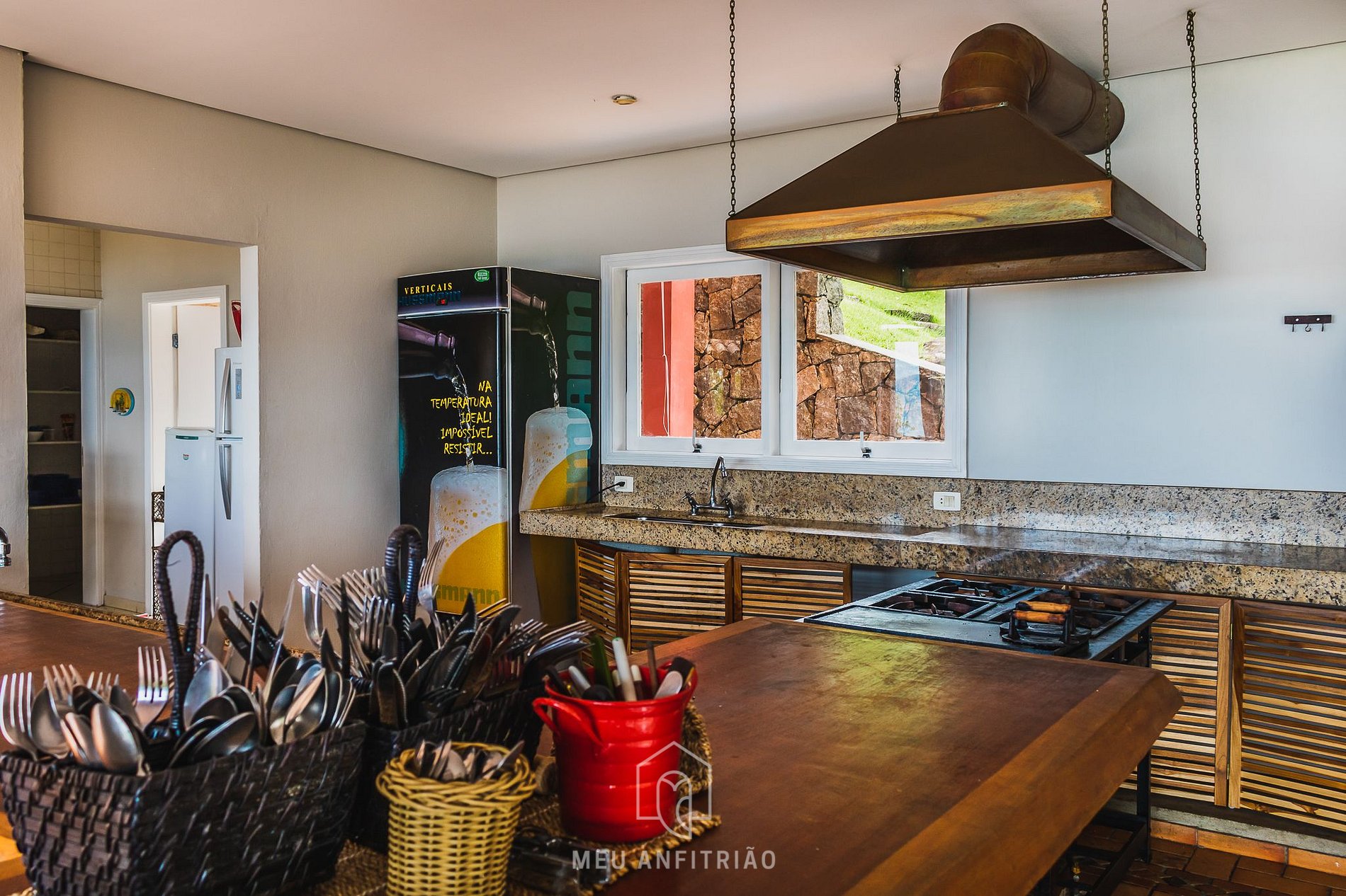 Upon arriving at the house via the garage, guests must climb a few flights of stairs. After climbing, they will reach the outdoor area, which features a lounge with sofas, a TV room with a fireplace, a gourmet area with a freezer, a pizza oven, an industrial stove, and a barbecue grill, a dining room, and a fully equipped kitchen with all the necessary utensils.